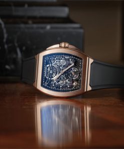 At WatchTime New York, Bianchet introduced the UltraFino Gold Edition, a warm, golden take on its ultra-thin tourbillon. The case is in 18K rose gold, its curves and edges echoing the architectural geometry that’s become a Bianchet signature. Inside beats the automatic Calibre UT01, a movement that’s just 3.85 mm thick, built from titanium, and finished in deep black PVD for contrast and drama.