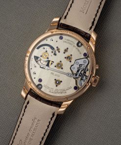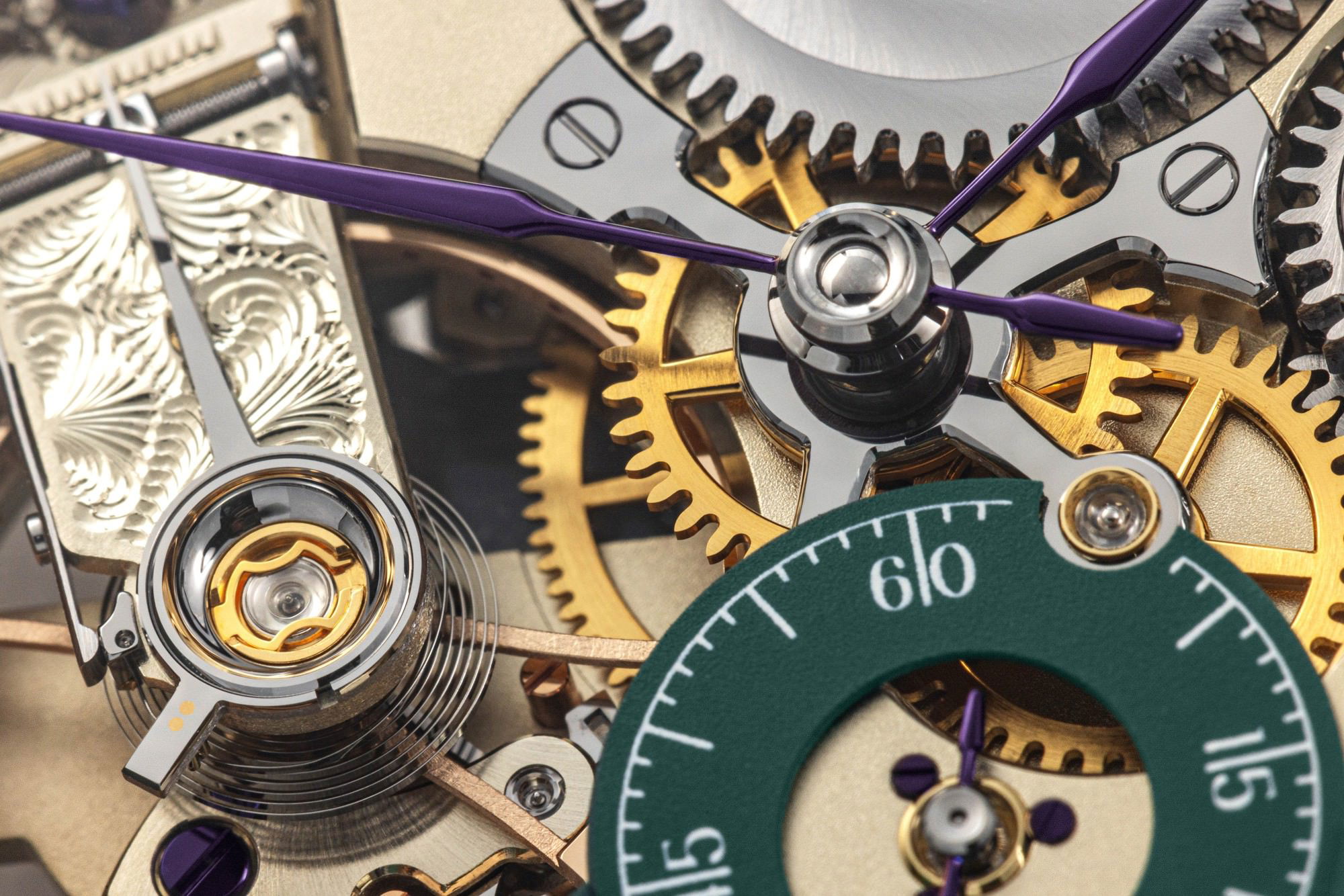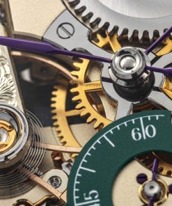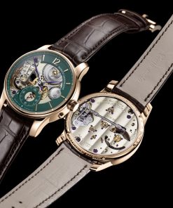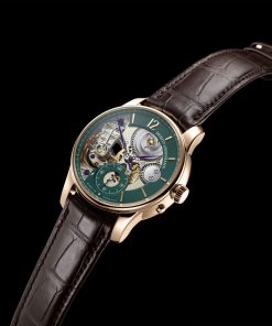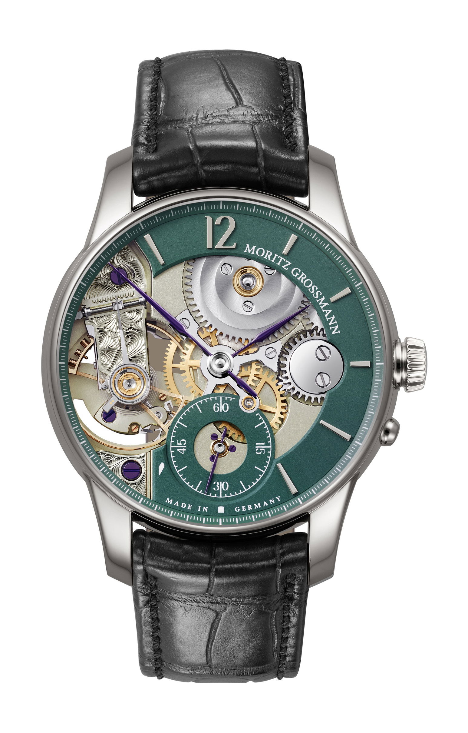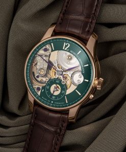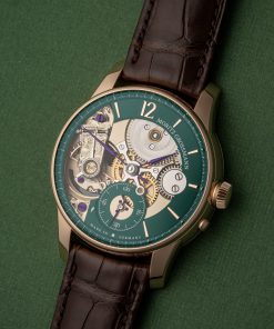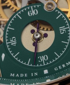 The movement’s mirrored construction presents a unique aesthetic, with the seconds hand mounted in a gold chaton, adding prominence to its display. The watch also features an in-house developed winder with pusher and stop seconds, visible on the back side. The green elements on the dial create a striking contrast against the gold-plated gear wheels, gold chatons, and polished screw heads, highlighting the watch’s sophisticated finish. The handcrafted hands, annealed in a brown-violet hue, add to the watch’s elegance. The BACKPAGE Green is a testament to Moritz Grossmann’s commitment to combining traditional Glashütte watchmaking art with contemporary design and exceptional finishing, marking a significant milestone in the manufactory’s history.