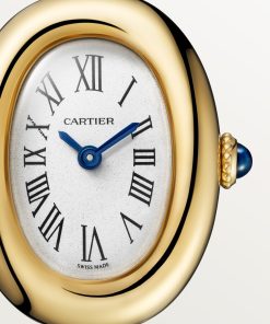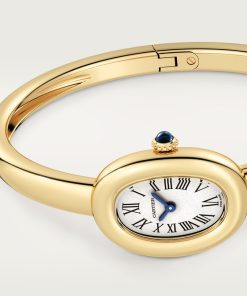 Baignoire de Cartier watch, mini model, size 15, quartz movement. 18K yellow gold (750/1000) case. 18K yellow gold (750/1000) beaded crown set with a sapphire cabochon. 18K yellow gold (750/1000) rigid bracelet. Silvered dial, blued-steel sword-shaped hands, sapphire crystal. Length: 24.6 mm, width: 18.7 mm, thickness: 7.2 mm. Water-resistant up to 3 bar (approx. 30 meters).