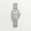 Baignoire de Cartier watch, mini model, size 16, quartz movement. Rhodium-finish 18K white gold (750/1000) case, rigid bracelet and beaded crown set with 552 brilliant-cut diamonds totaling 5 carats. Silvered dial, blued-steel sword-shaped hands, sapphire crystal. Length: 24.6 mm, width: 18.7 mm, thickness: 7.2 mm. water-resistant up to 3 bar (approx. 30 meters/100 feet).