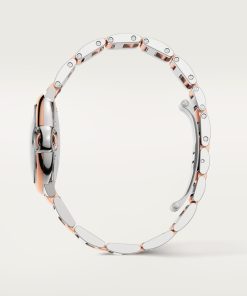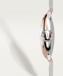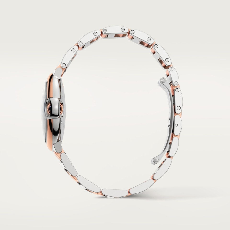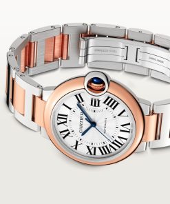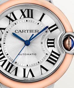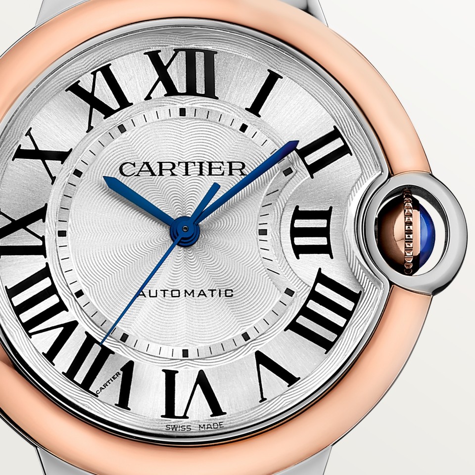 Ballon Bleu de Cartier watch, 36 mm, mechanical movement with automatic winding. Steel case, rose gold 750/1000 bezel, rose gold 750/1000 fluted crown set with a cabochon synthetic spinel. Silver guilloché dial. Blued-steel sword-shaped hands. Sapphire crystal. Two-tone interchangeable bracelet. Thickness: 12.1 mm. Water-resistant up to 3 bar (approx. 30 meters/100 feet).