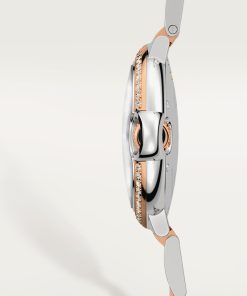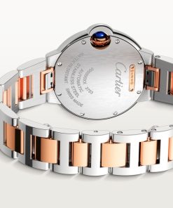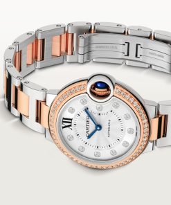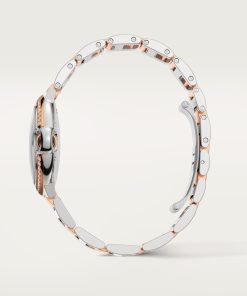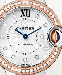 Ballon Bleu de Cartier watch, 33 mm, mechanical movement with automatic winding. Steel case, fluted rose gold 750/1000 crown set with a cabochon synthetic spinel. Rose gold 750/1000 bezel and silver guilloché dial, set with 61 brilliant-cut diamonds totaling 0.63 carat. Blued-steel sword-shaped hands. Sapphire crystal. Rose gold 750/1000 and steel interchangeable bracelet. Case thickness: 10.49.35.35.35 mm. Water-resistant up to 3 bar (approx. 30 meters/100 feet).