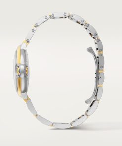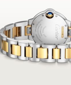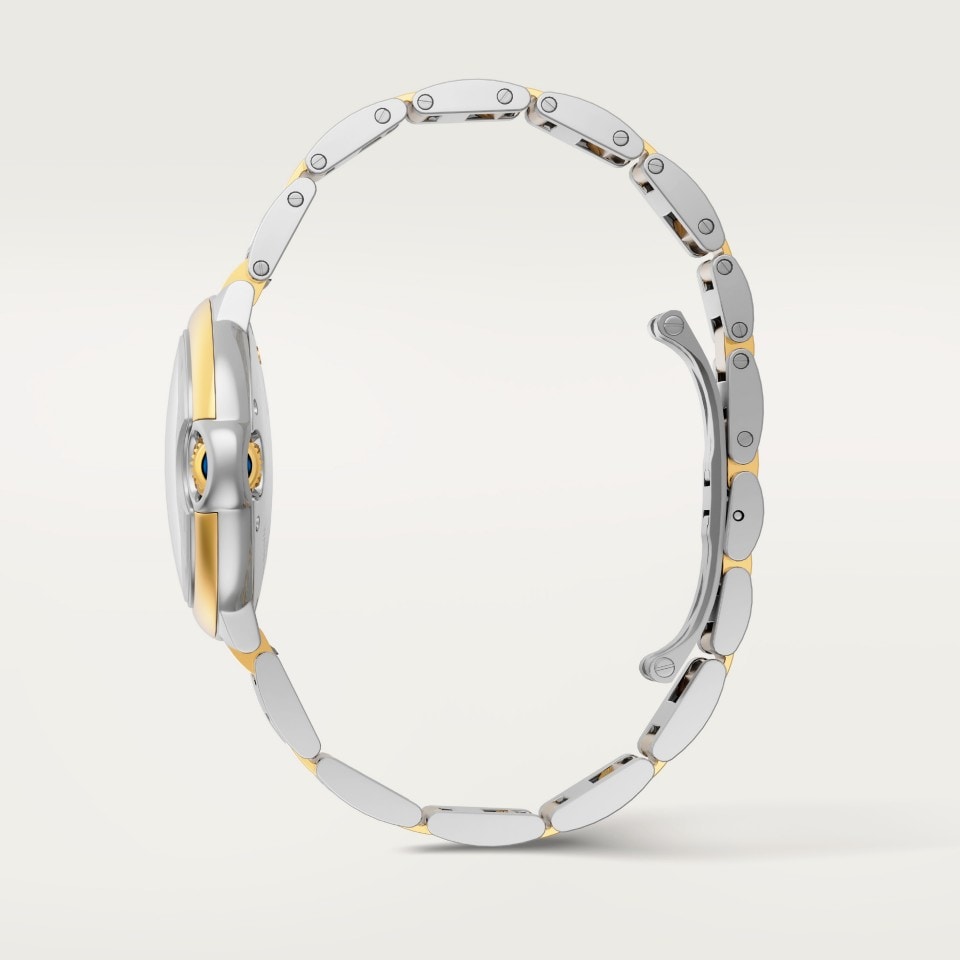 Ballon Bleu de Cartier watch, 33 mm. Mechanical movement with automatic winding. Steel case, fluted 18K yellow gold (750/1000) crown set with a synthetic cabochon-shaped spinel. Silvered guilloché dial. Blued-steel sword-shaped hands. Sapphire crystal. Interchangeable two-tone strap. Thickness: 10.16 mm. Water-resistant up to 3 bar (approx. 30 meters/100 feet).