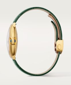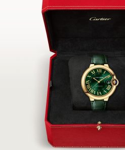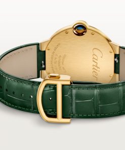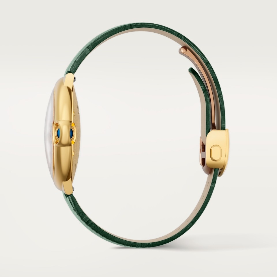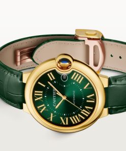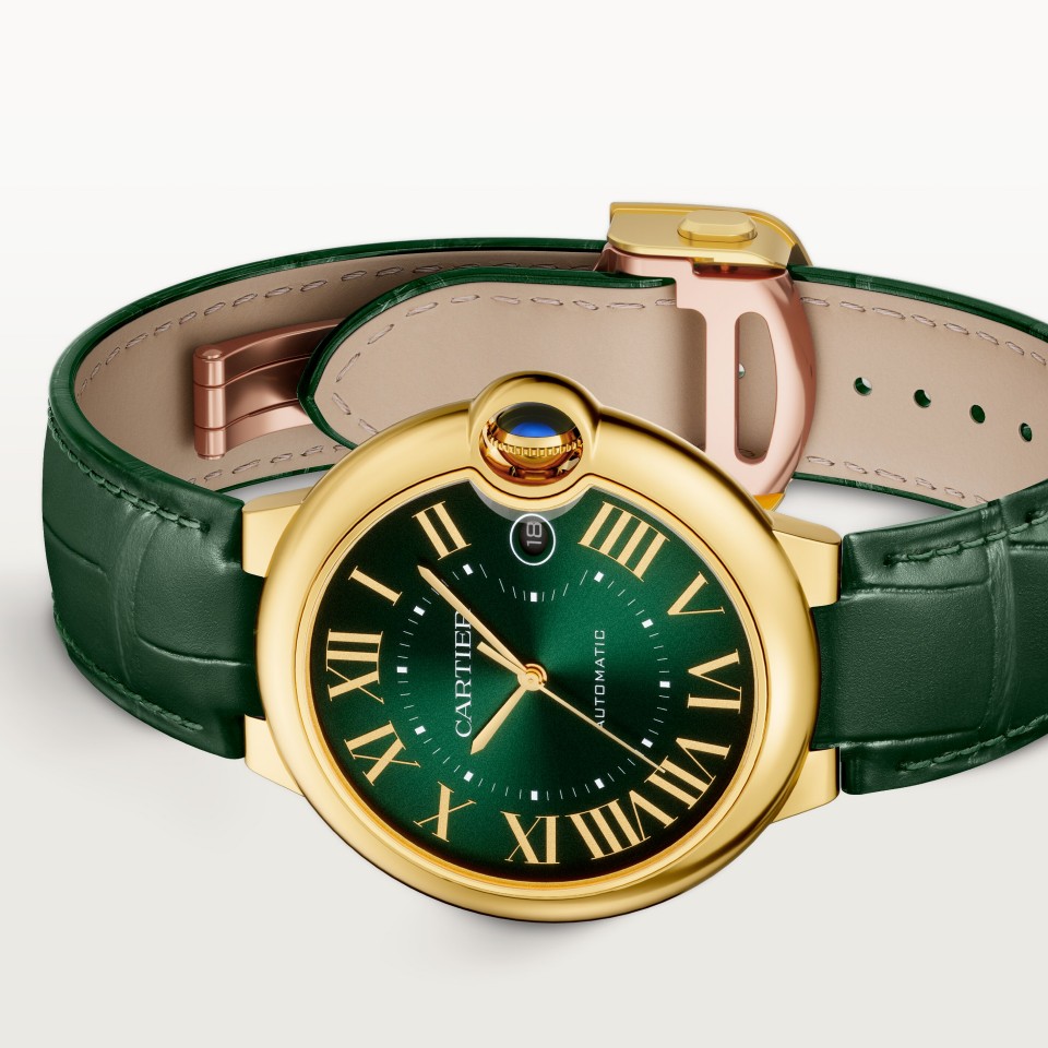 Ballon Bleu de Cartier watch, 40 mm, mechanical movement with automatic winding, caliber 1847 MC. 18K yellow gold (750/1000) case, fluted 18K yellow gold (750/1000) crown set with a sapphire cabochon, green sunray dial, golden-finish steel sword-shaped hands. Sapphire crystal. Interchangeable green alligator leather strap, 18K yellow gold (750/1000) interchangeable folding clasp, calendar aperture at 3 o’clock. Thickness: 12.4 mm. Water-resistant up to 3 bar (approx. 30 meters/100 feet).