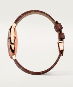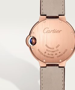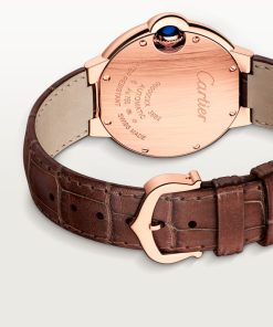 Ballon Bleu de Cartier watch, 33 mm, mechanical movement with automatic winding. Rose gold 750/1000 case, fluted crown set with a blue cabochon-shaped sapphire, silvered guilloché lacquered opaline dial, 12 Roman numerals, blued-steel sword-shaped hands, sapphire crystal, strap in alligator leather, rose gold 750/1000 ardillon buckle. Case dimensions: diameter: 33 mm, thickness: 10.16 mm. Water-resistant up to 3 bar (approx. 30 meters/100 feet).