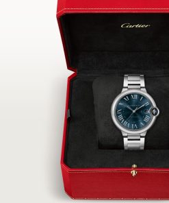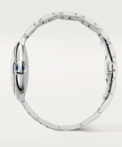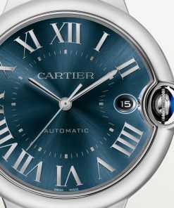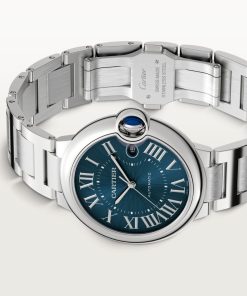 Ballon Bleu de Cartier watch, 40 mm, Manufacture mechanical movement with automatic winding, caliber 1847 MC. Steel case, fluted crown set with a synthetic cabochon-shaped spinel, blue sunray-brushed dial, silvered sword-shaped hands, sapphire crystal, interchangeable steel bracelet, calendar aperture at 3 o’clock. Thickness: 12.4 mm. Water-resistant up to 3 bar (approx. 30 meters/100 feet).