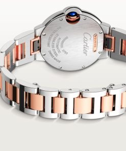 Ballon Bleu de Cartier watch, 33 mm, mechanical movement with automatic winding. Steel case, rose gold 750/1000 bezel, rose gold 750/1000 fluted crown set with a cabochon synthetic spinel. Silver guilloché dial. Blued-steel sword-shaped hands. Sapphire crystal. Two-tone interchangeable bracelet. Thickness: 10.16 mm. Water-resistant up to 3 bar (approx. 30 meters/100 feet).