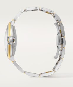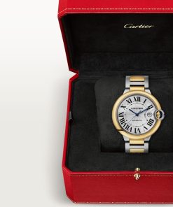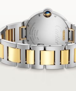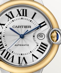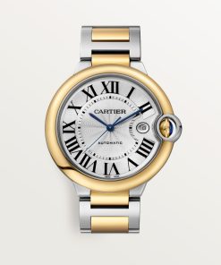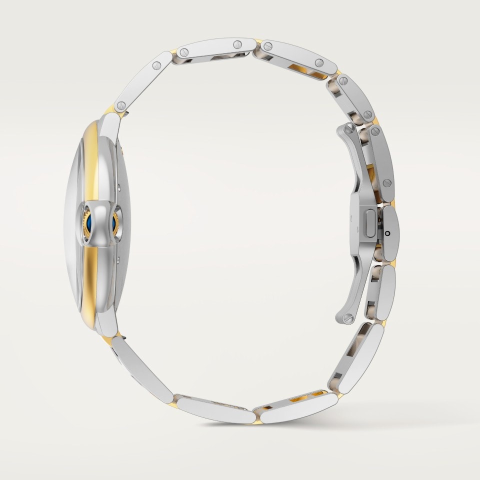 Ballon Bleu de Cartier watch, 42 mm. Mechanical movement with automatic winding, caliber 1847 MC. Steel case, fluted 18K yellow gold (750/1000) crown set with a synthetic cabochon-shaped spinel. Silvered guilloché dial. Blued-steel sword-shaped hands. Sapphire crystal. Calendar aperture at 3 o’clock. Interchangeable two-tone strap. Thickness: 13 mm. Water-resistant up to 3 bar (approx. 30 meters/100 feet).