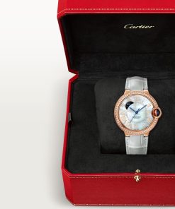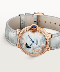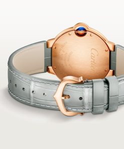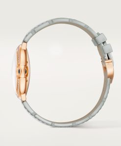 Ballon Bleu de Cartier watch, 36 mm. Mechanical movement with automatic winding, day/night. 18K rose gold (750/1000) case set with 54 brilliant-cut diamonds totaling 0.79 carats. Fluted 18K rose gold (750/1000) crown set with a sapphire cabochon. Mother-of-pearl dial with day and night indicator disc. Blued-steel sword-shaped hands. Sapphire crystal. Strap in gray sage alligator leather, 18K rose gold (750/1000) ardillon buckle. Case thickness: 12.11 mm. Water-resistant up to 3 bar (approx. 30 meters/100 feet).