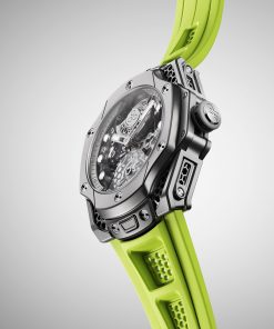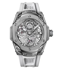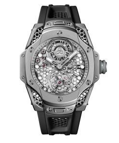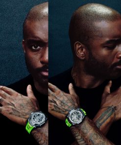 Each design element within the Hublot Big Bang Tourbillon SR_A by Samuel Ross, from titanium plates to the aerodynamic shapes, is meticulously curated to manifest a durable, ergonomic, and incredibly lightweight object that embodies motion and precision. The timepiece operates on the Manufacture HUB6035 caliber, with 282 components ensuring an impeccable 72-hour power reserve, encapsulating the essence of technical brilliance and design expertise. This testament to artistic ingenuity and technological prowess is available in a limited edition, showcasing fifty unique pieces, each reflecting Ross’s dedication to evolving creativity and precise refinement in watchmaking.