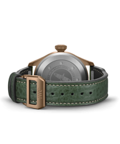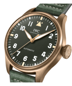 The Big Pilot’s Watch 43 Spitfire features a military aesthetic with a bronze case and crown, as well as a military green dial and gold-plated hands.