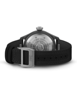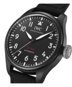 The Pilot’s Watch 43 TOP GUN features a case made of black ceramic, a black dial, and a titanium case back and crown.