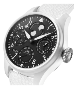 The Big Pilot’s Watch Perpetual Calendar TOP GUN Lake Tahoe combines IWC’s perpetual calendar with a striking white ceramic case, emblematic of the company’s materials expertise.