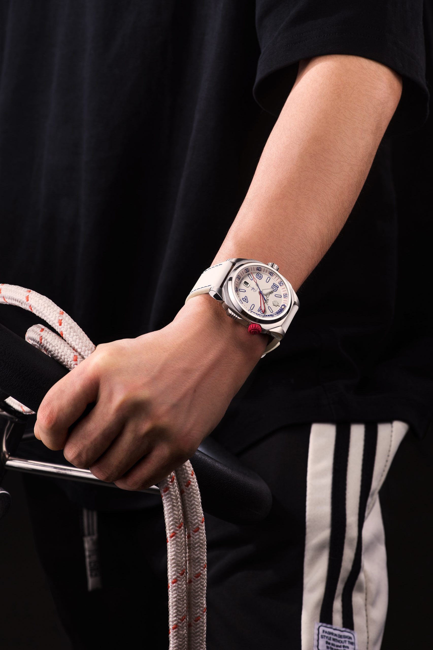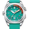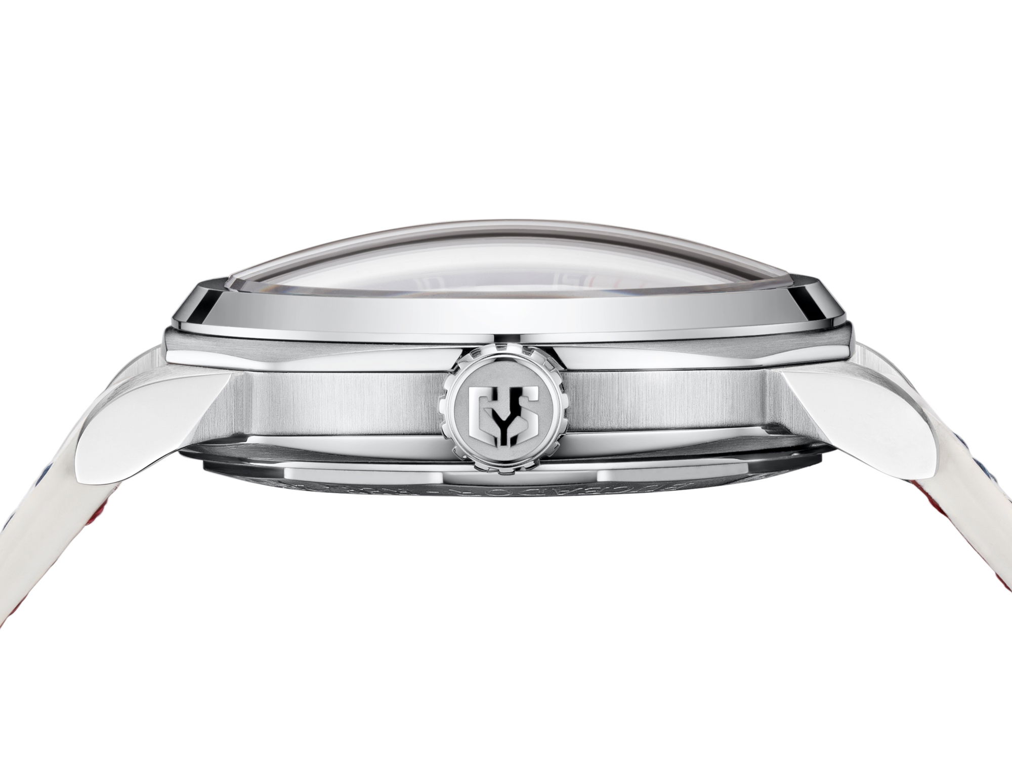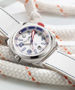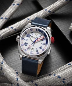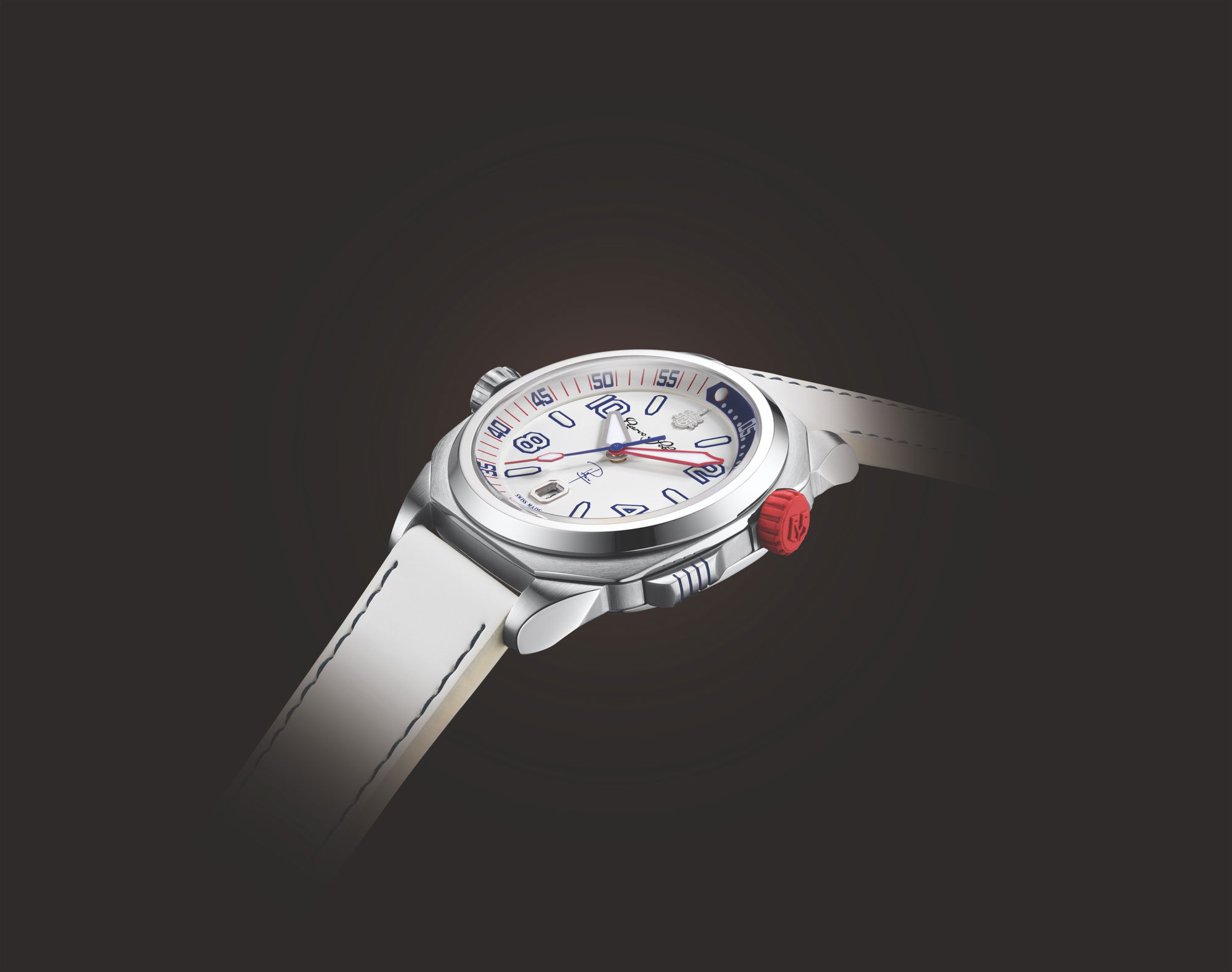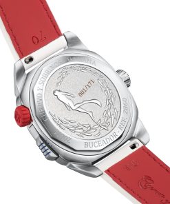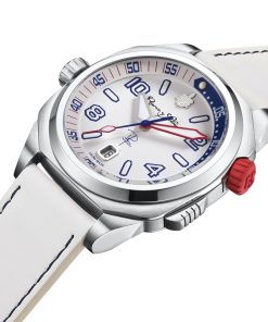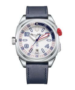 The solid case back is engraved with a diver and tropical fish. Powered by the CYS 8126 automatic caliber, the watch includes a high-gloss white rubber strap and an additional blue leather strap, both fastening with a steel pin buckle engraved with the CyS emblem.
