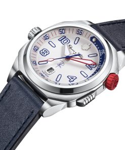 The watch features a white dial accented with blue and red, bold hour and minute hands, and white indices with blue outlines. The minute hand is edged in red for visibility, and both hands and indices are lined with Super-LumiNova®. The blue center seconds hand has a red-outlined lollipop, and there is a date aperture at the base of the dial.