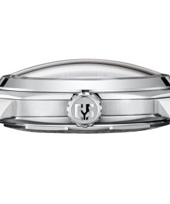 The 43mm steel case is water-resistant to 200m. A pusher at 4 o’clock unlocks the crown at 2 o’clock, which adjusts the internal rotating bezel for monitoring dive time. Another crown at 9 o’clock sets the time and winds the mainspring.