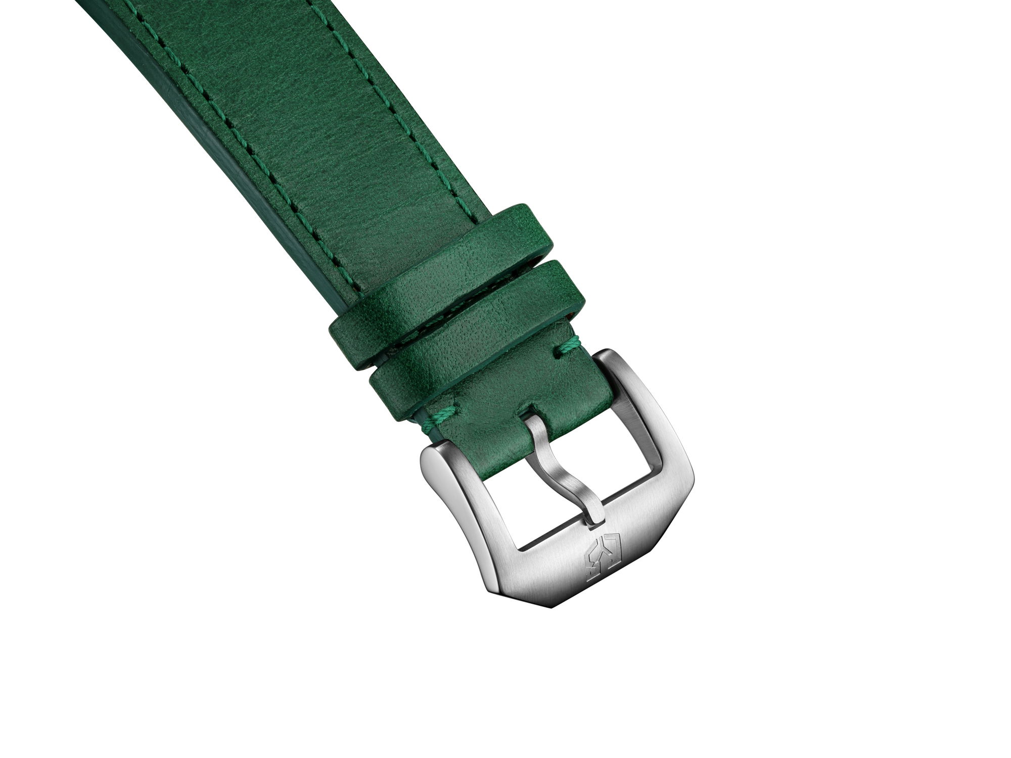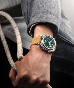 The Buceador Caribe, named after the Spanish word for ‘diver,’ returns with fresh updates and a new movement for enhanced performance. The watch has a highly durable case, offering water resistance up to 200 meters. Its innovative design includes a pusher system to adjust the internal rotating bezel for dive monitoring. The series includes five color options, turquoise, green, navy blue, black, and bright blue, fitted with rubber. An additional leather strap is included.