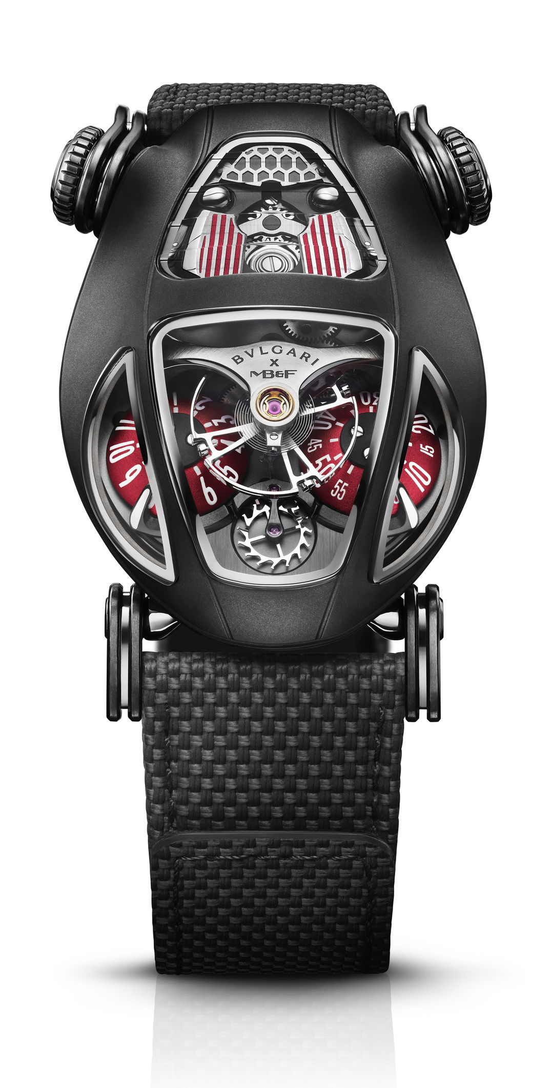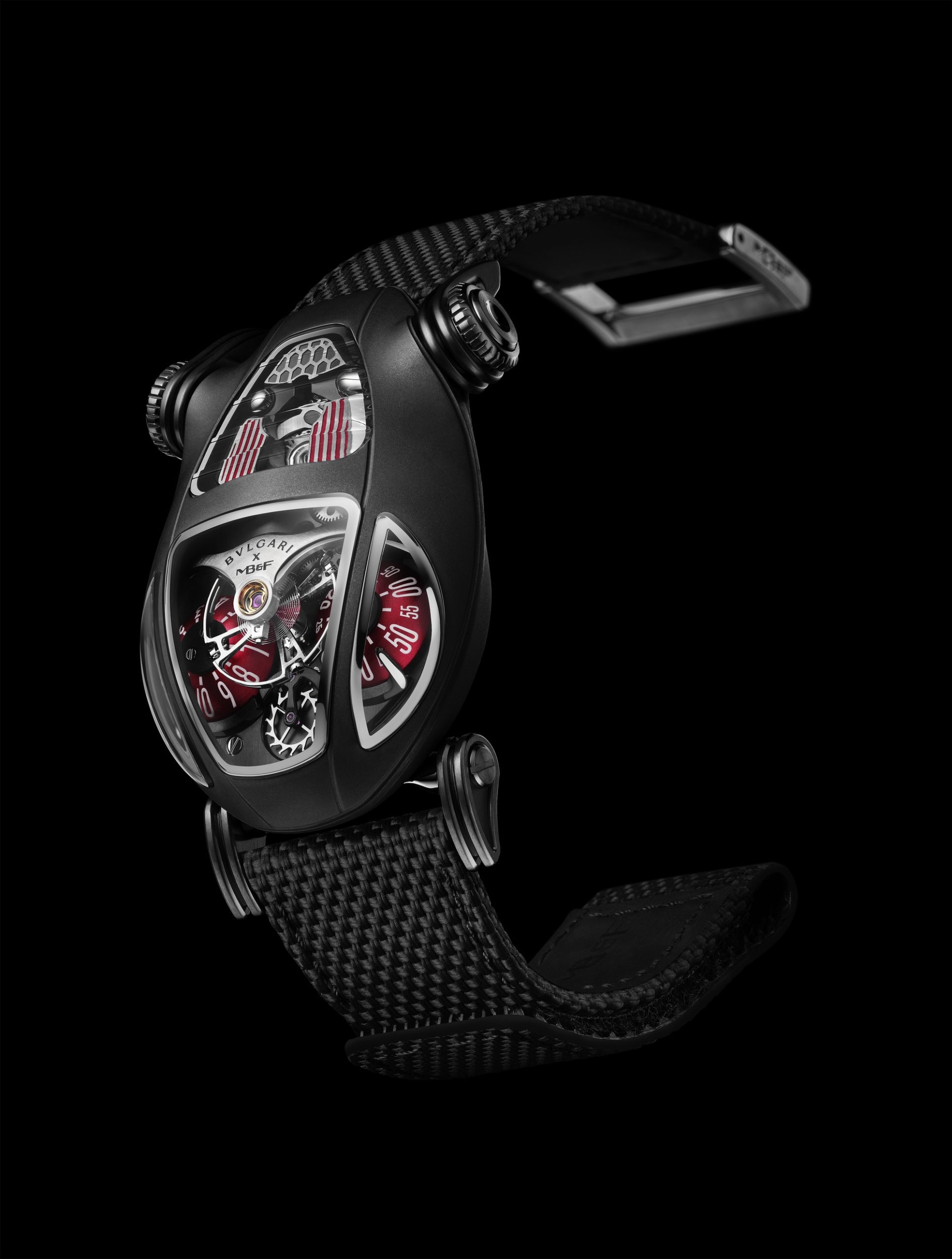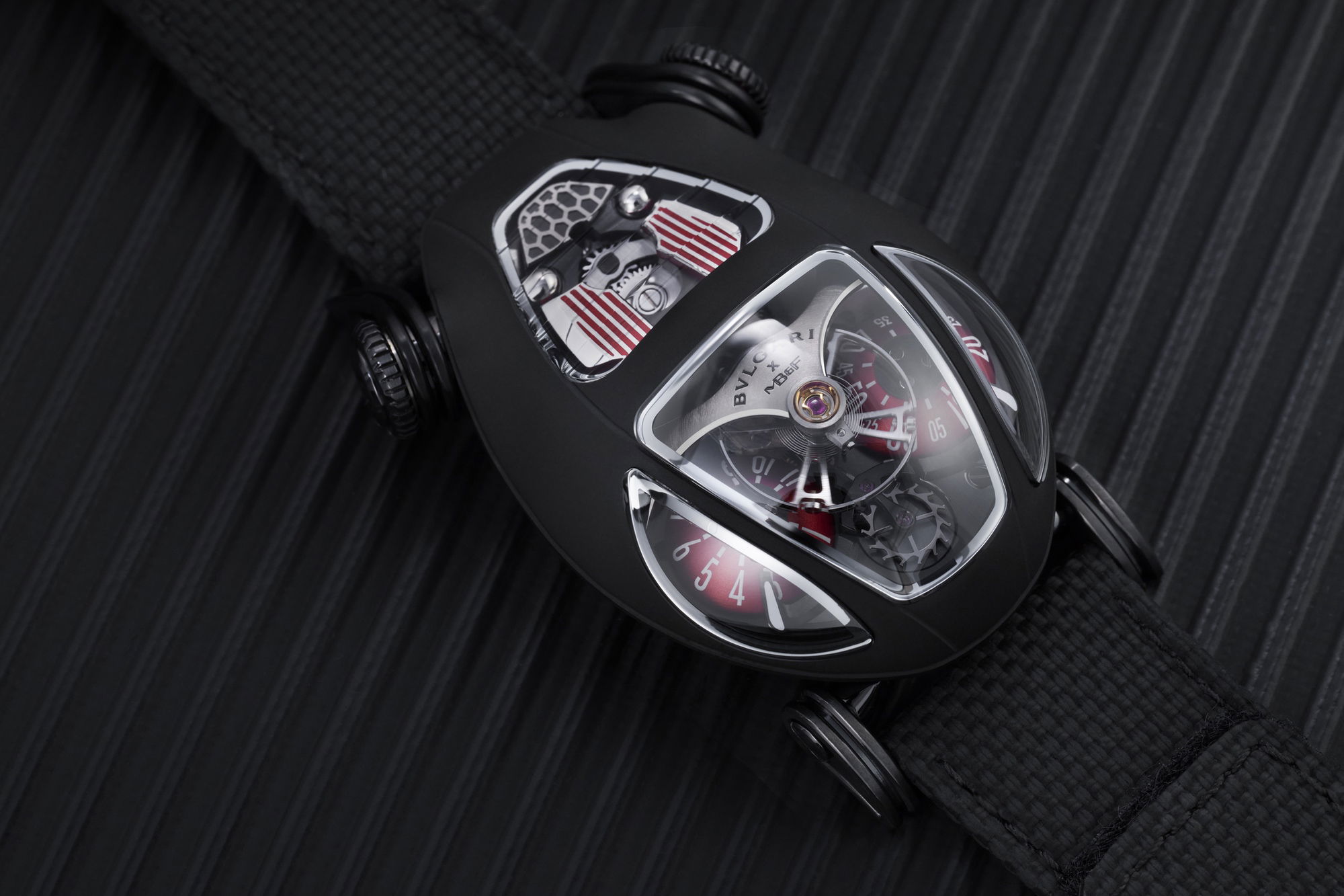 The Bvlgari x MB&F Serpenti comes in three versions, each restricted to 33 pieces: titanium with blue domes, 18K rose gold with green domes, and black PVD stainless steel with fiery red domes.