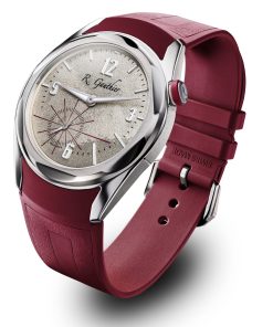 The C by Romain Gauthier Edition Five features a uniquely faceted titanium bezel and case back, complemented by a sculpted case band and lugs that carry both satin and polished finishes. The design also extends to the rubber strap with a titanium pin buckle, creating a seamless look. The crown is strategically placed at 2 o’clock to increase wrist movement comfort, featuring a rubber ring for enhanced grip.