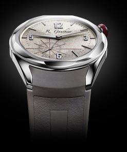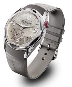 The C by Romain Gauthier Titanium Edition Five is a handcrafted luxury timepiece that emphasizes meticulous hand-finishing within a sporty and modern aesthetic. The design of the watch incorporates a sleek case made from Grade 5 titanium, chosen for its properties and aesthetic, offering durability and comfort.