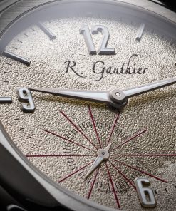 Each C by Romain Gauthier Titanium Edition Five in the edition is uniquely marked as “1 of 38,” highlighting its exclusivity. The dial is architecturally modern, with off-center hands, varying length hour markers, and small seconds marked by tapering lines to create a perspective of continuity. The fifth edition brings a new Champagne color dial with hand-engraving on titanium, adding depth through light play and reflection. The hands and markers are made from white gold and filled with Super-LumiNova for increased legibility.