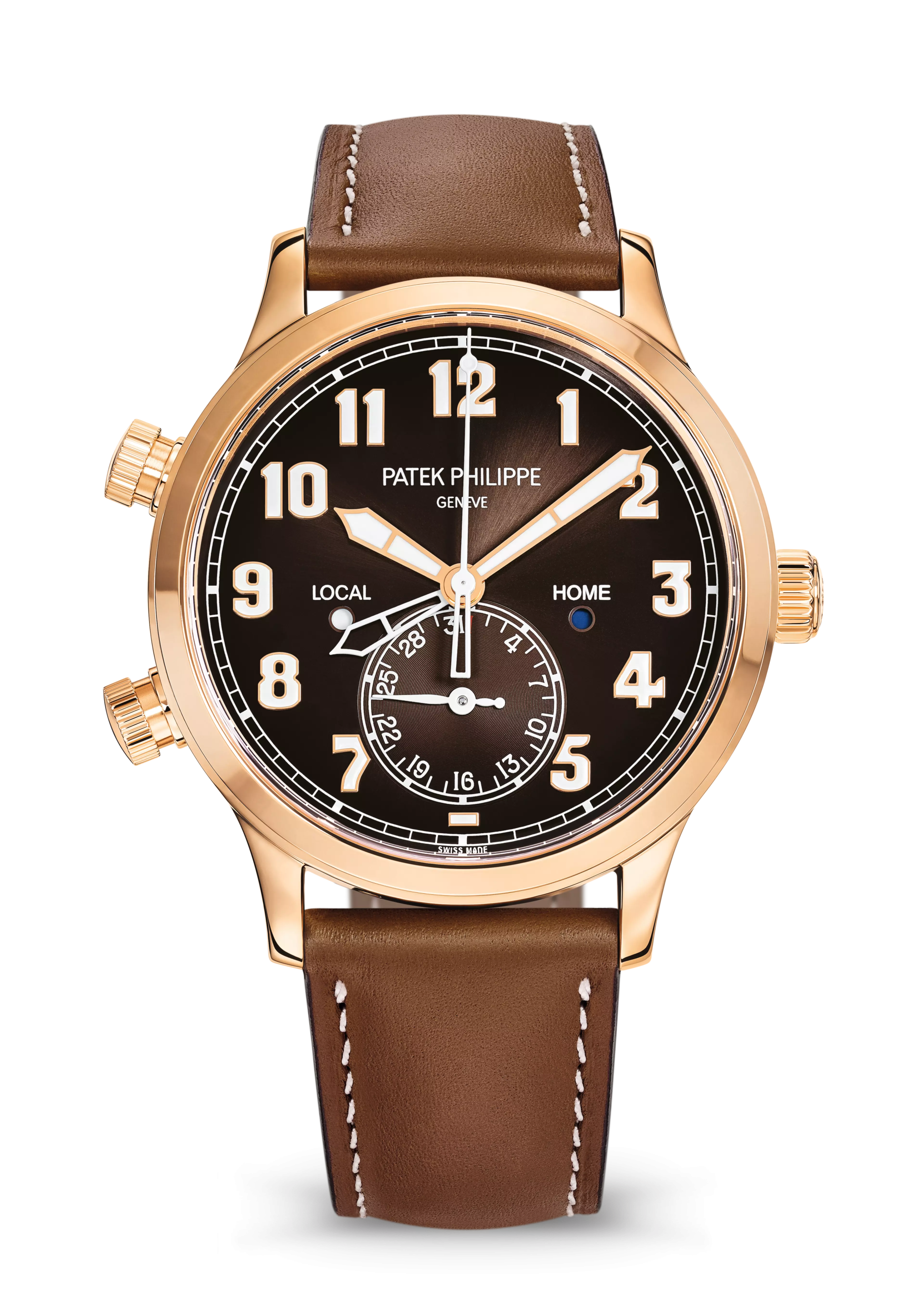 Equipped with a second time-zone display and a date indication linked to local time, this self-winding Calatrava Pilot Travel Time has a rose gold case framing a brown dial with black-gradient rim. A refined look for this original timepiece paying tribute to the Patek Philippe tradition of aviator-style’s watches.