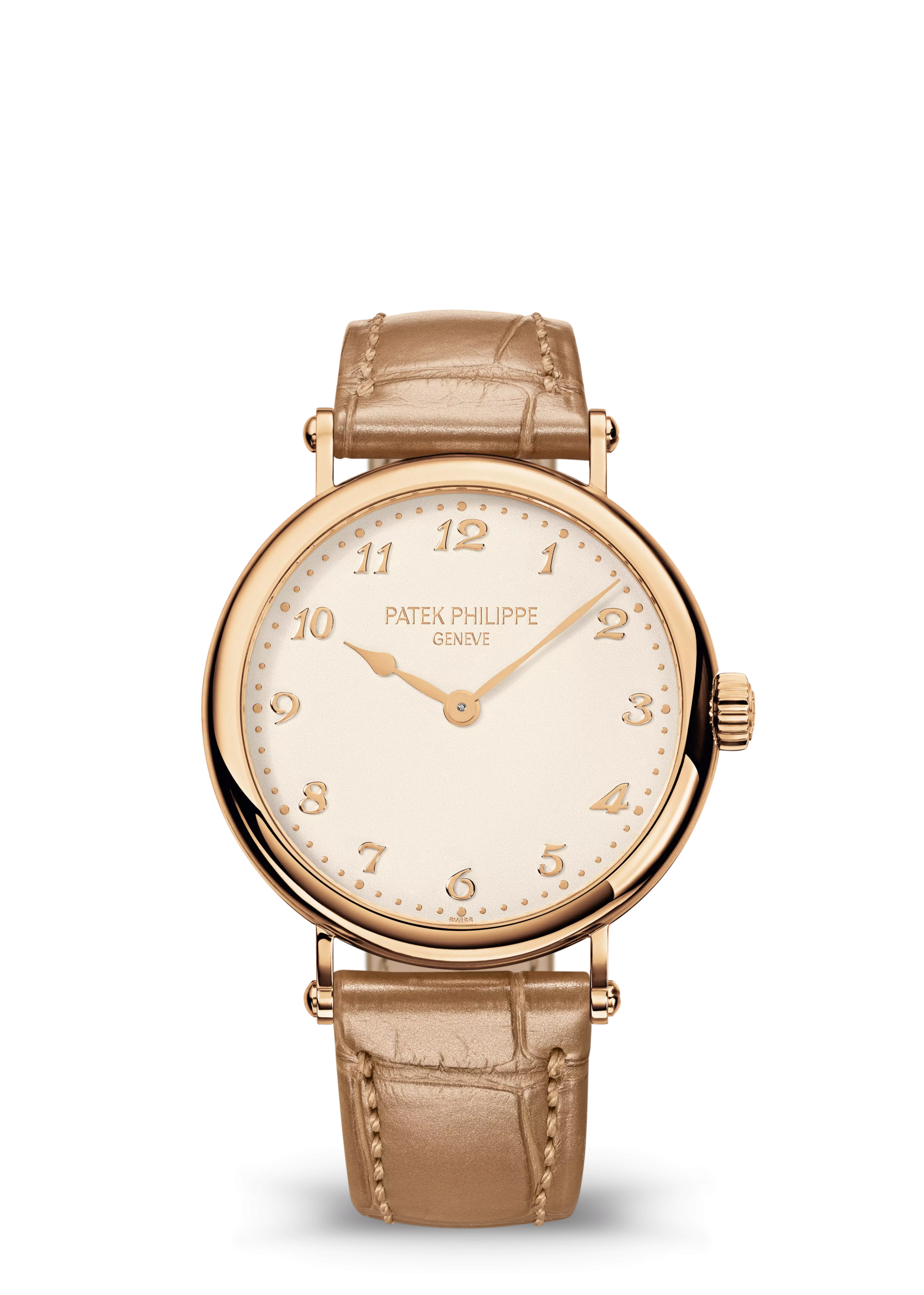 With its uncluttered dial on which nothing disturbs the flow of hours and minutes, along with its Officer’s-style case with straight lugs, this rose gold timepiece embodies the quintessence of Calatrava’s feminine aesthetic. The ultra-thin self-winding movement ensures the watch’s elegant slenderness on the wrist.
