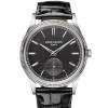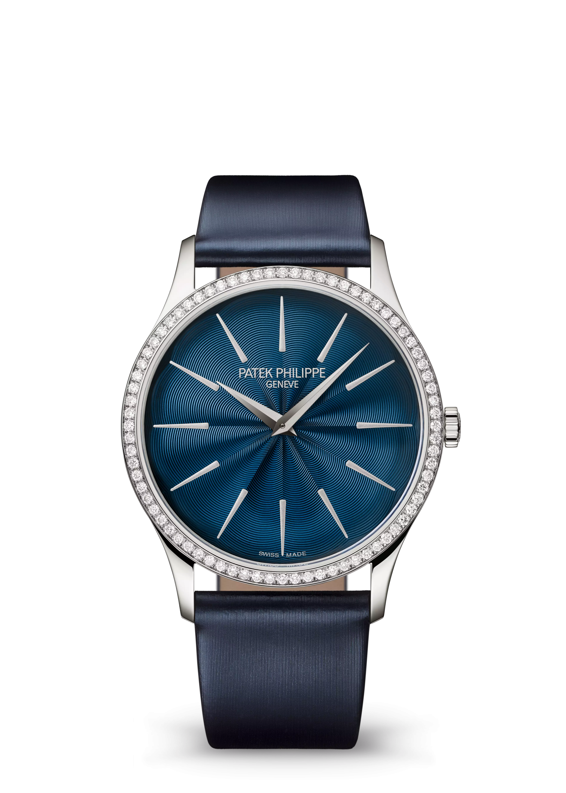 On this self-winding Calatrava, the dial plate is first embossed with a concentric wave motif, then coated with dozens of successive layers of translucent midnight blue lacquer creating a fascinating depth effect. The bezel is lit up by a setting of diamonds. The color of the satin-finish brushed calfskin strap matches that of the dial.