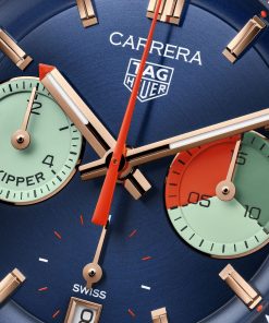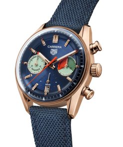 The Carrera Chronograph Skipper,’s color scheme pays homage to the yacht ‘Intrepid’, reflecting elements of the boat’s design. It also includes triangular markers and a ‘Skipper’ nameplate, all in rose gold to match the case.