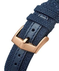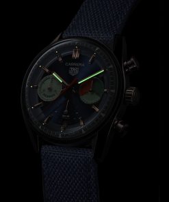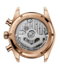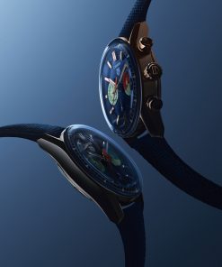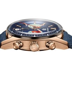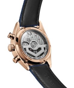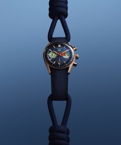The watch’s transparent case back showcases the Heuer 02 Skipper calibre, a column wheel chronograph movement with an 80-hour power reserve. It comes with a blue textile strap and a pin buckle made of rose gold.