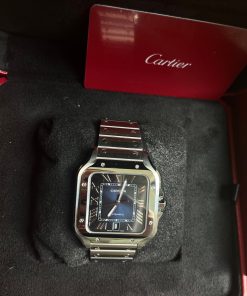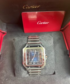 Santos watch, large model, mechanical movement with automatic winding, caliber 1847 MC. Steel case, 7-sided crown set with a faceted synthetic spinel, graduated blue dial, steel sword-shaped hands, sapphire crystal. Steel bracelet with “SmartLink” adjustment system. Second bracelet in navy blue calfskin, with interchangeable steel folding buckle. Both bracelets are fitted with the “QuickSwitch” interchangeability system. Case width: 39.8 mm, thickness: 9.38mm. Water-resistant to 10 bar (approx. 100 meters/330 feet).