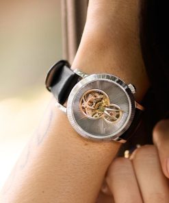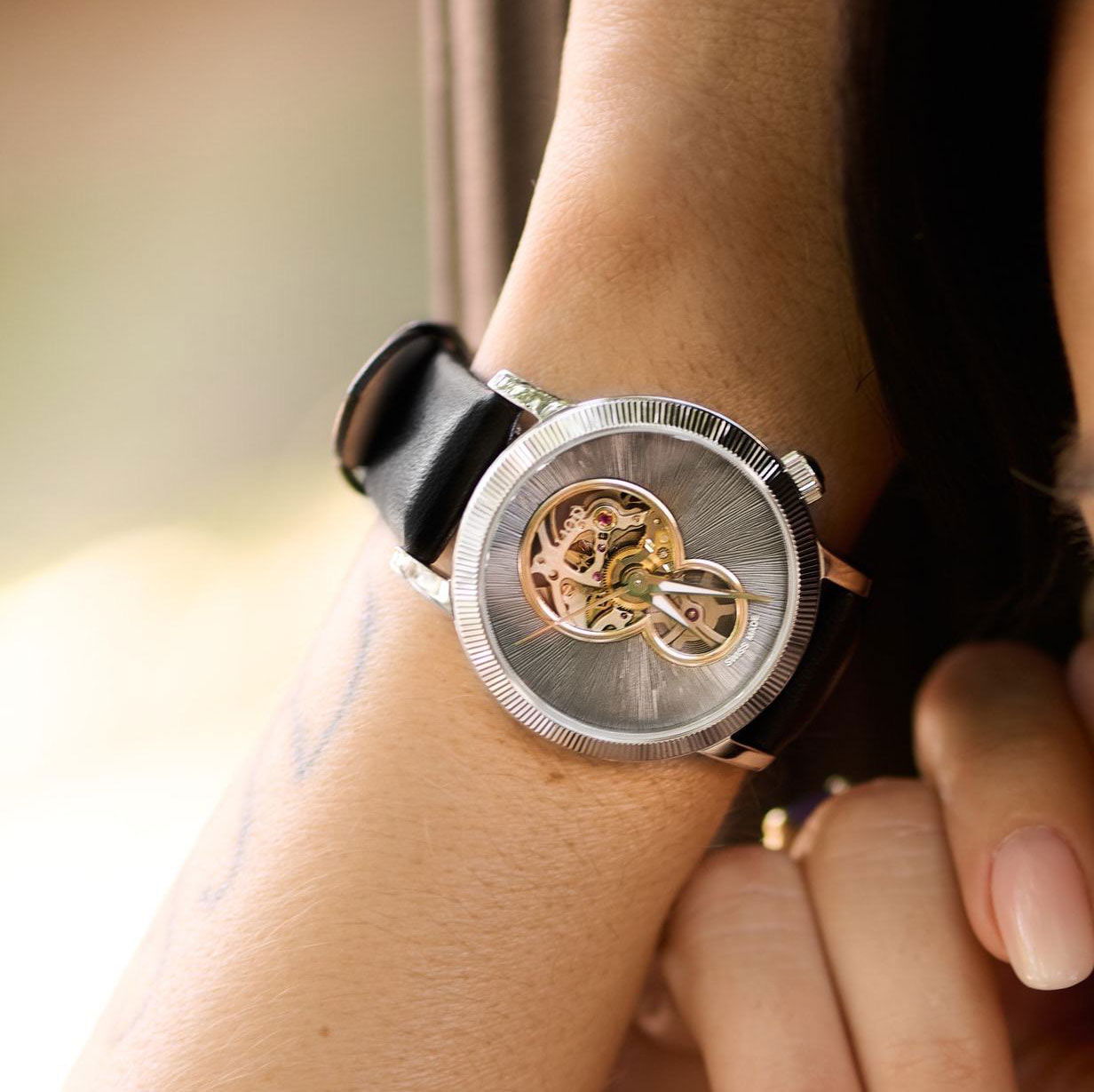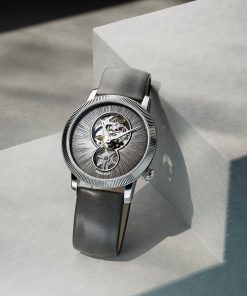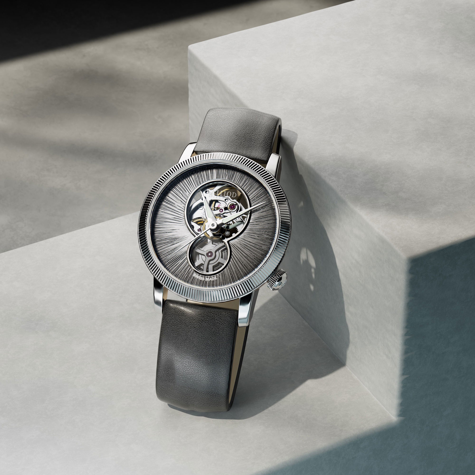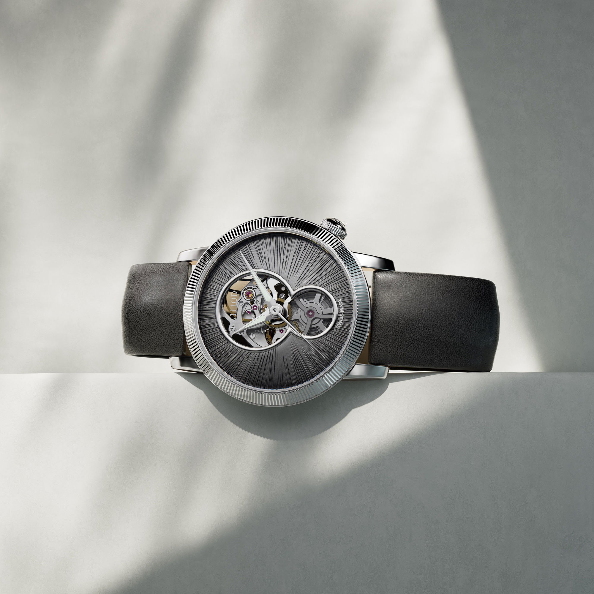 The collection was brought to life by Senior Designer Liliane Murenzi, who leaned into nature-inspired color palettes and clean geometry to shape the line’s soft yet assertive character. Dials come in champagne, ash grey, mint, sky blue, and ice white, each paired with a slim profile, rounded lugs, and that recognizable 4 o’clock crown. A tinted glass disc offers a subtle reveal of the automatic caliber inside, keeping the spirit of openwork alive without sacrificing elegance. A notched bezel echoes the sunburst dial finish, catching light in just the right way.