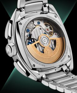 Both watches feature the signature 41 mm cushion-shaped steel case, 14 mm in height and water-resistant to 10 ATM. Finishing alternates between brushed and polished surfaces, while an integrated two-link steel bracelet and additional FKM rubber strap ensure versatility. Inside beats the FLC02 automatic chronograph, developed with La Joux-Perret, equipped with a thermally blued column wheel for precise, crisp engagement and a 60-hour power reserve. Visible through the sapphire back, the movement displays Geneva stripes, perlage, blued screws, and a skeletonized rotor, details that underline Favre Leuba’s dedication to modern craftsmanship rooted in tradition.