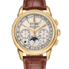 This rose gold perpetual calendar chronograph is distinguished by its Goutte (droplet-style) gold bracelet fully integrated into the case – a refined design exclusive to Patek Philippe. The ebony black sunburst dial features a legible, well-balanced face, while the calendar mechanism is exceptionally slim.
