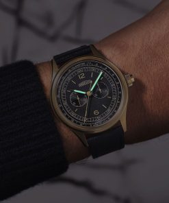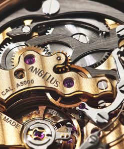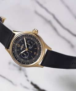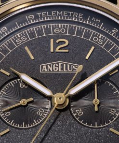 The black dial, a rarity in the Angelus archive, draws inspiration from a vintage piece in William Massena’s personal collection. Beneath the domed sapphire crystal, every detail is deliberate: a grained center, snailed subdials, and golden telemeter and tachymeter scales that frame the display. Polished gold numerals and hands, filled with Super-LumiNova, provide warmth and clarity, while the slim bezel and sharply curved lugs give the watch a refined presence on the wrist.