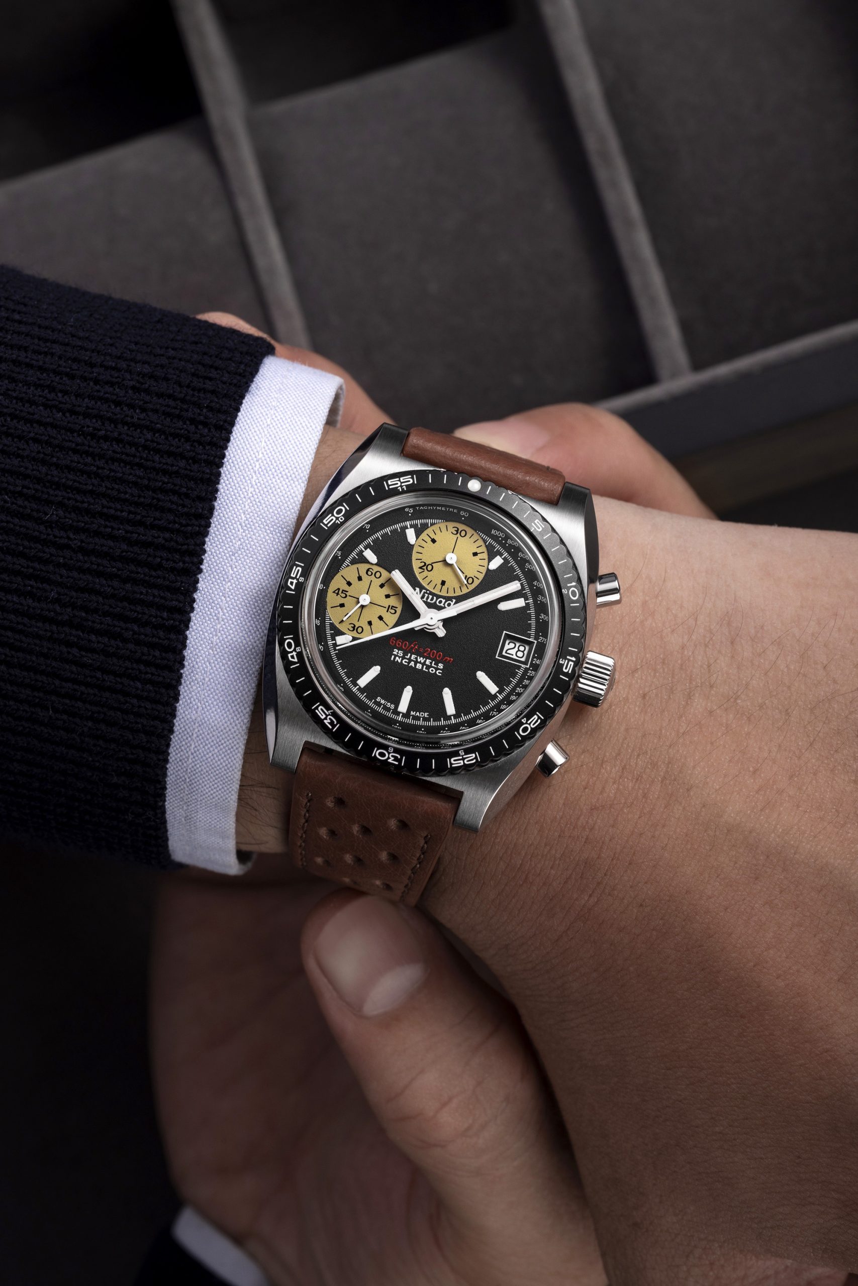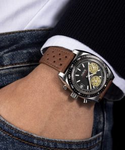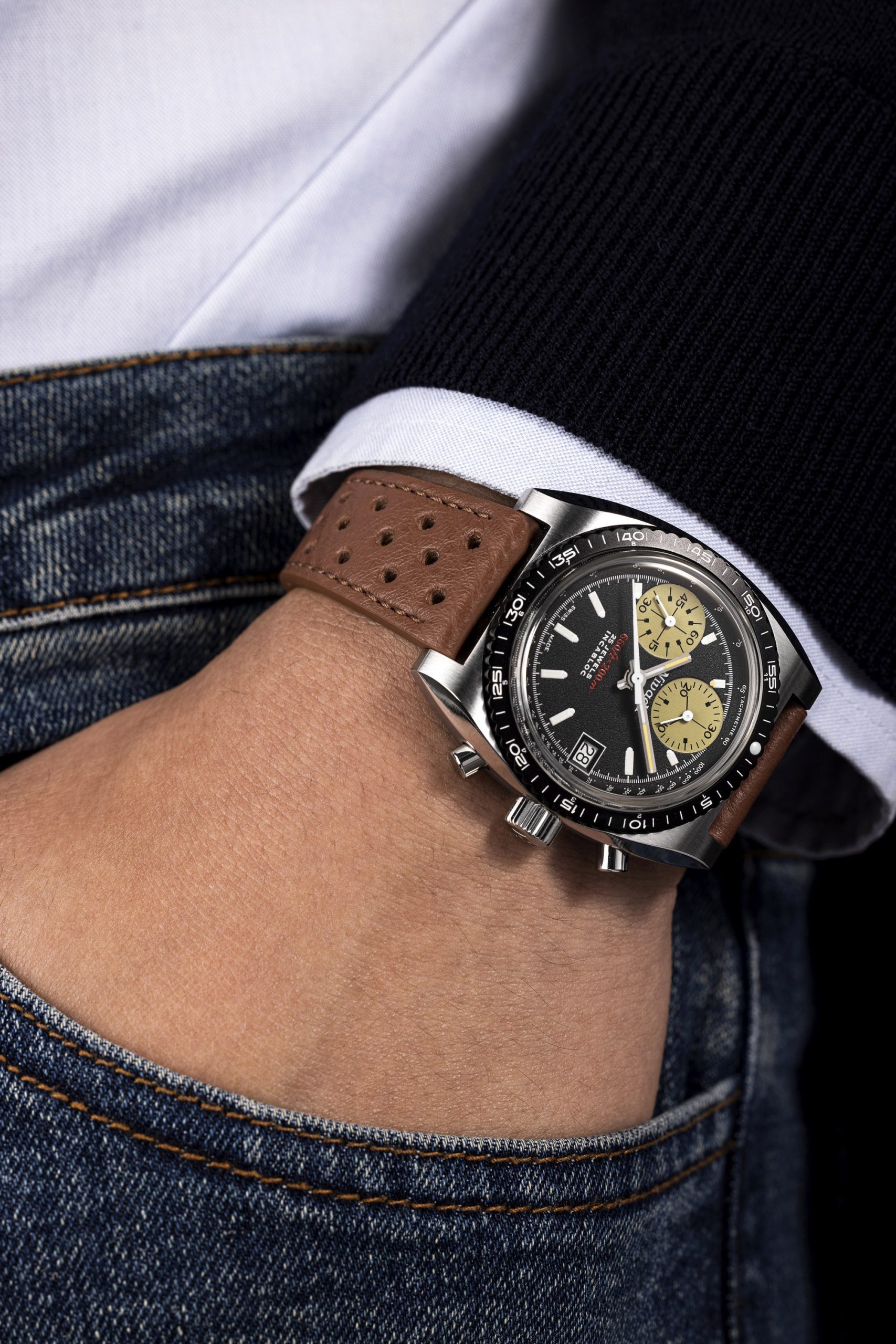 The new Chronosport is celebrated for its unique dial, featuring a textured matte black background, two embossed sub-dials in taupe with a hint of khaki, and a tachymeter scale. It also features either white or yellow Super-LumiNova® indices and hands, a bold white logo, and Art Deco typography, all designed by renowned dial maker Jean Singer.