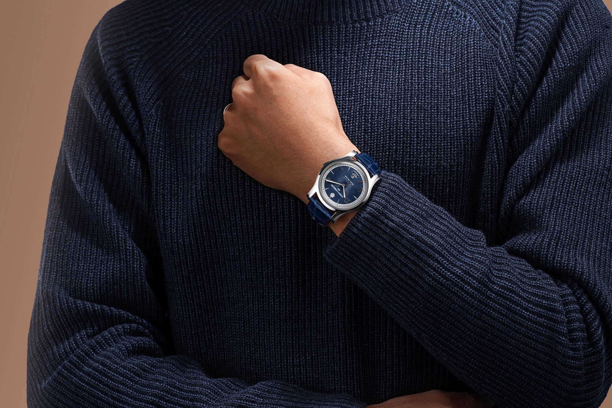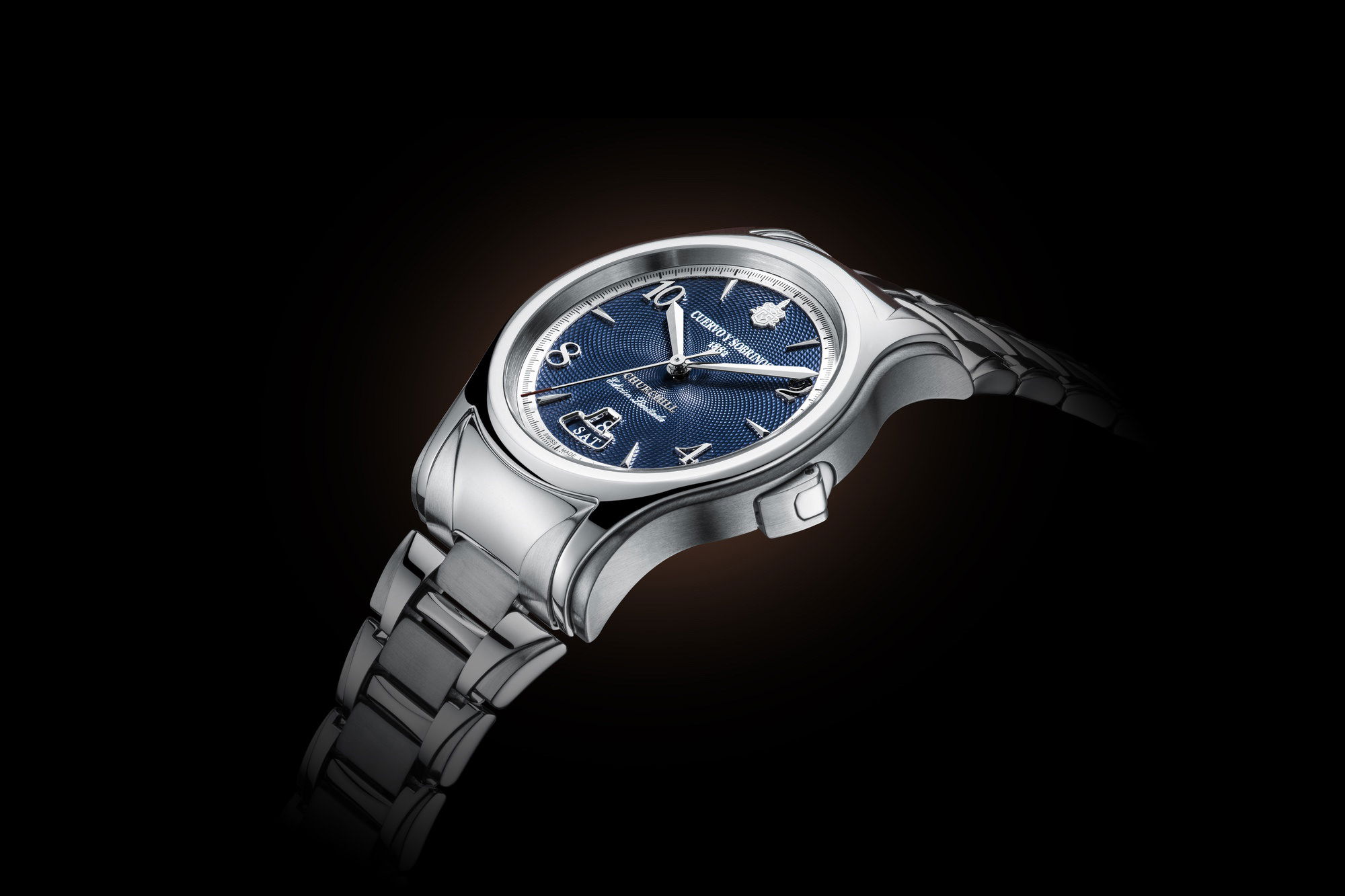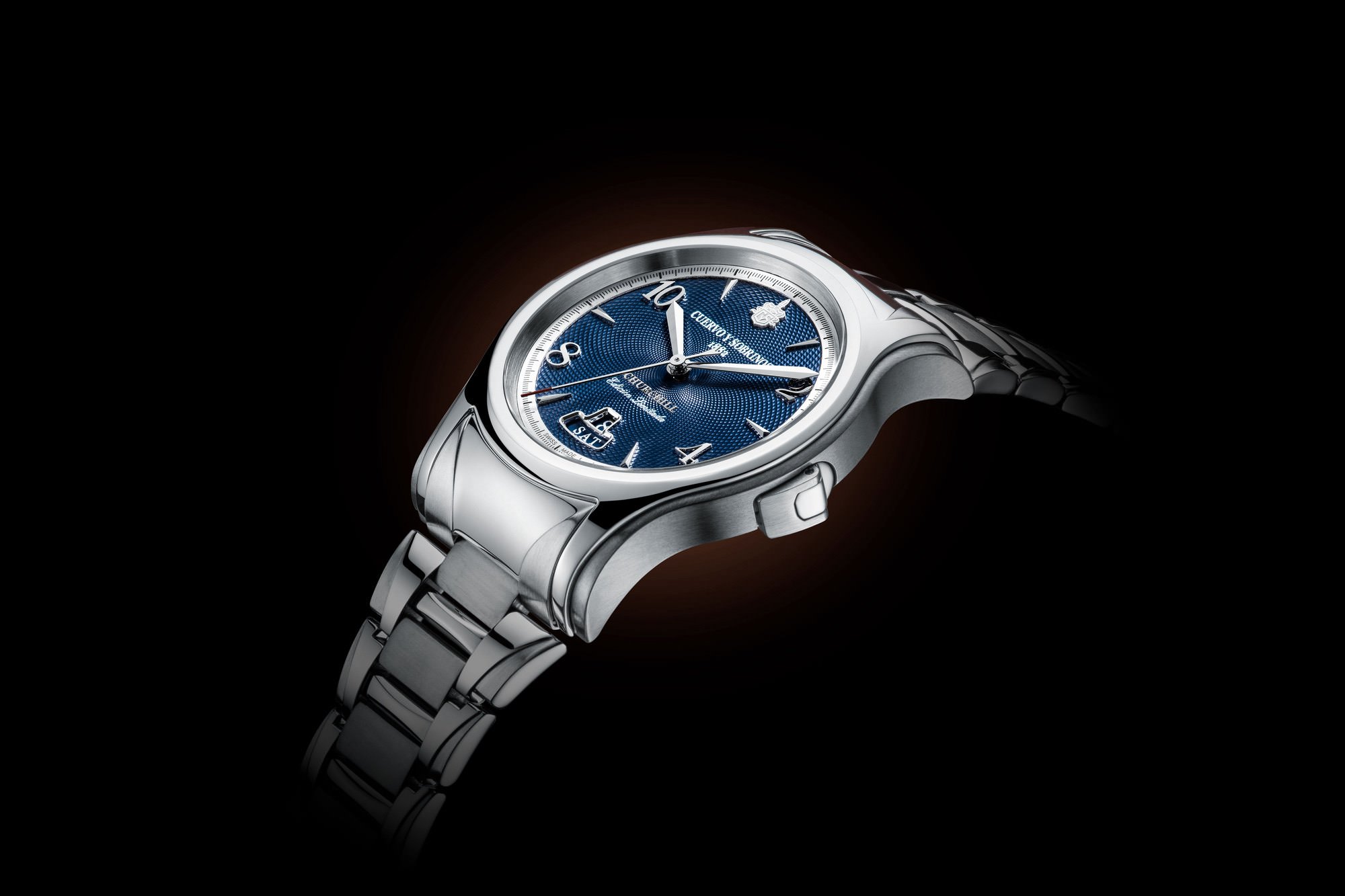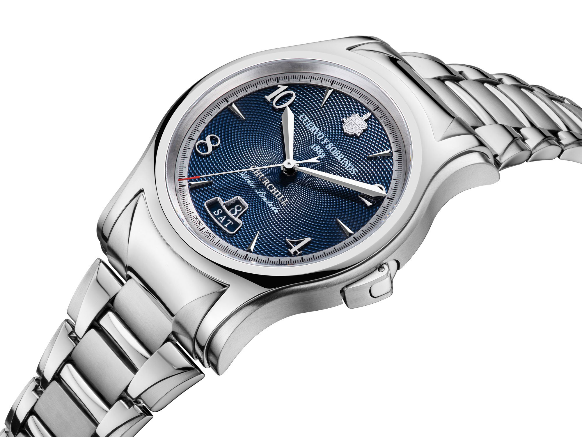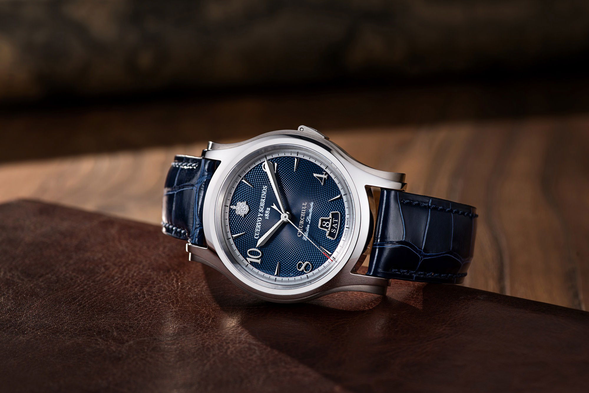 The Churchill Sir Winston watch is available in petrol blue, British green, or burgundy with guilloché dials. The dials feature silver-toned hour and minute hands, prominent hour markers, and Super-LumiNova for low-light visibility. The guilloché dial displays the day and date, while the 43mm case is in stainless steel and titanium and houses a Swiss automatic movement. The crown design is unique, and the case back includes a quote from Churchill. Each watch comes with an additional alligator strap and is limited to 200 pieces.