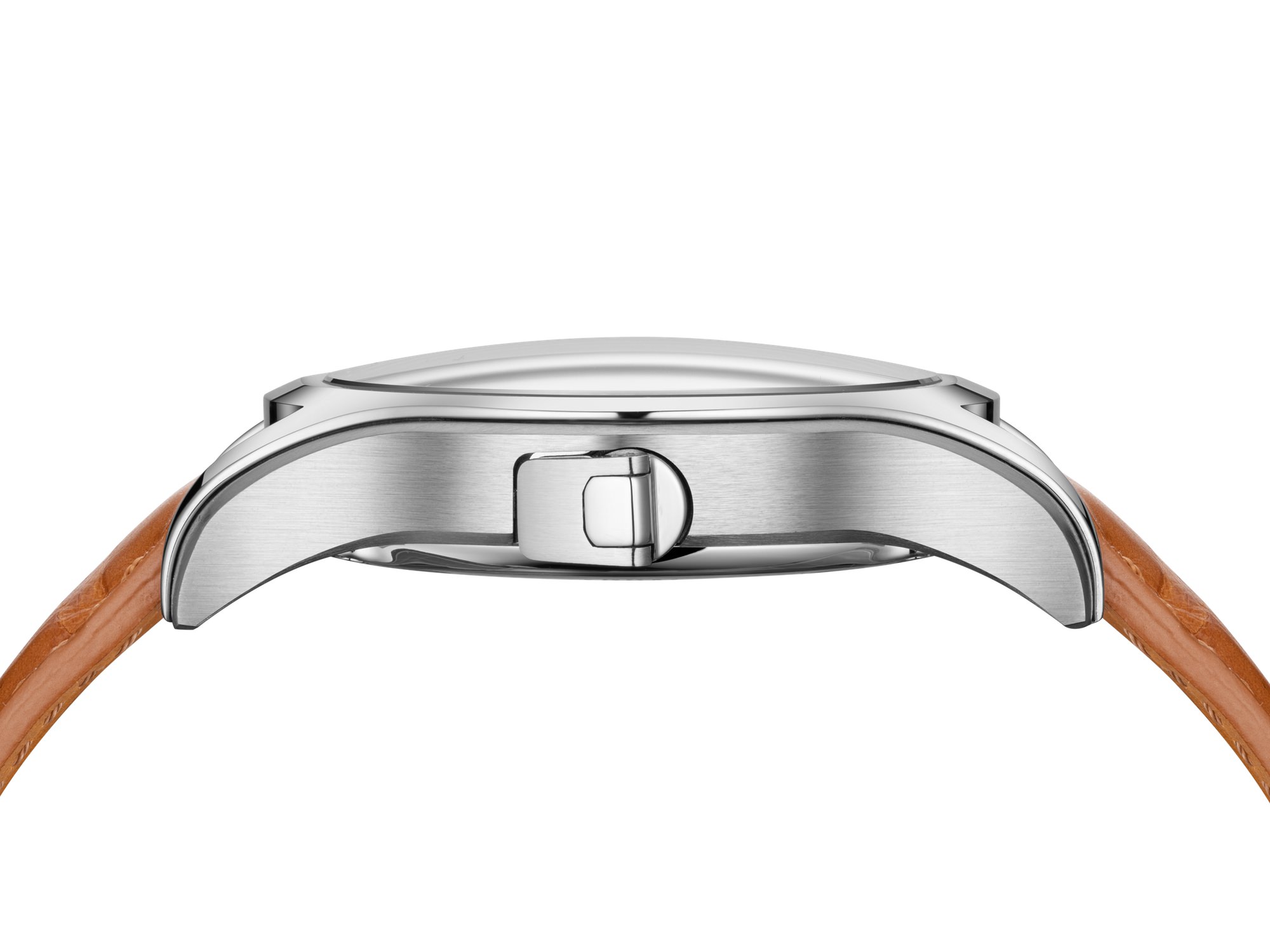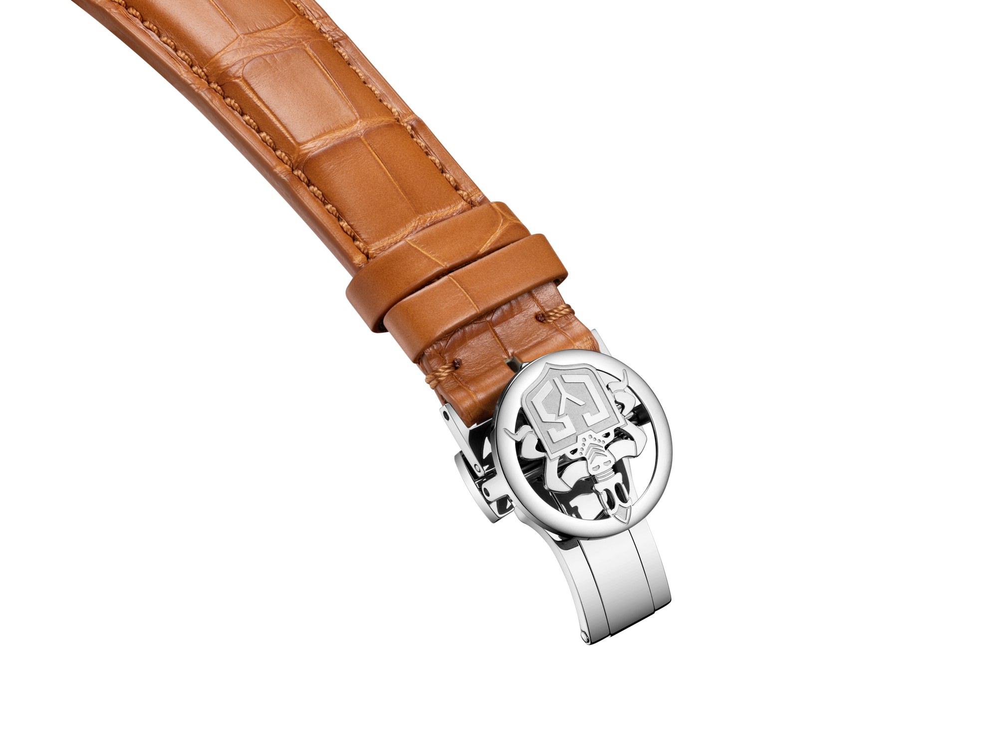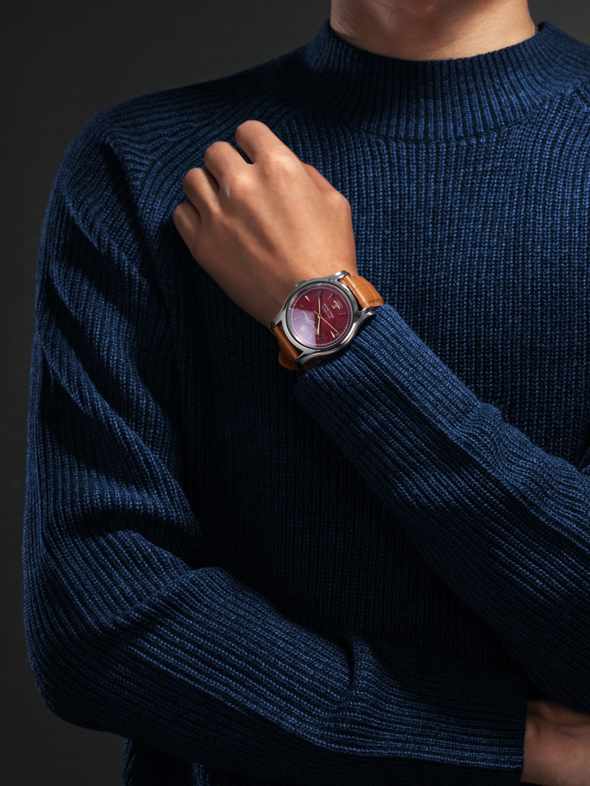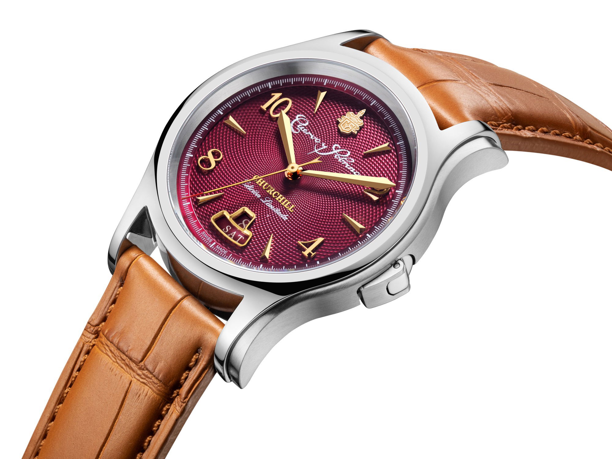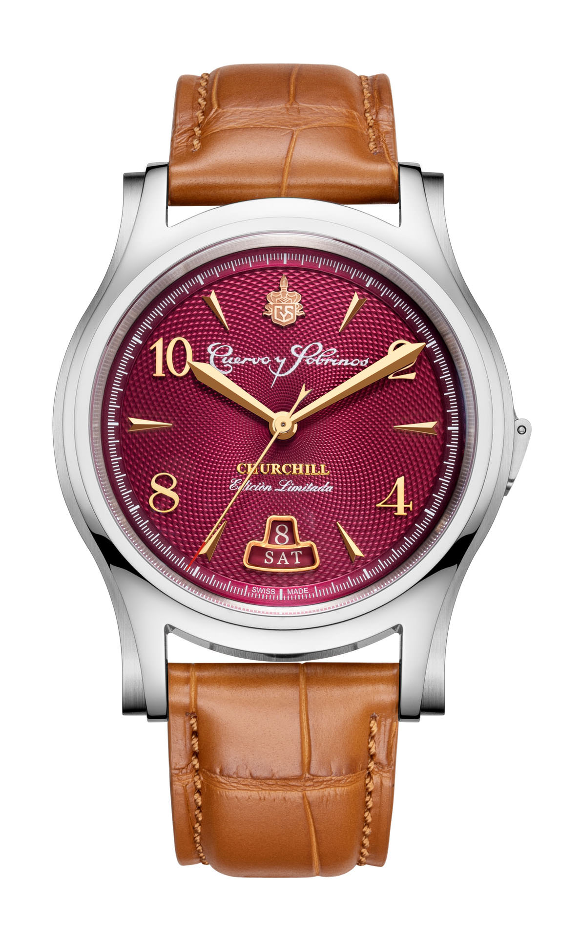 The Churchill Sir Winston watch is available in petrol blue, British green, or burgundy with guilloché dials. The dials feature silver-toned hour and minute hands, prominent hour markers, and Super-LumiNova for low-light visibility. The guilloché dial displays the day and date, while the 43mm case is in stainless steel and titanium and houses a Swiss automatic movement. The crown design is unique, and the case back includes a quote from Churchill. Each watch comes with an additional alligator strap and is limited to 200 pieces.