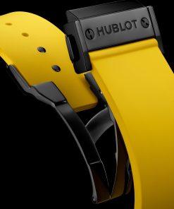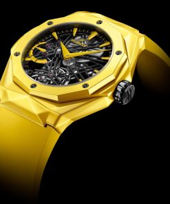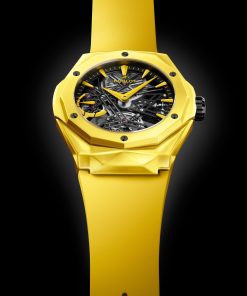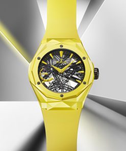 The Classic Fusion Tourbillon Orlinski is a unique collaboration between Hublot and artist Richard Orlinski, blending vibrant colors, edgy design, and advanced mechanics. It features a skeleton tourbillon, a five-day power reserve, and is known for its fusion of art and watchmaking. The watch comes in two versions: one in radiant yellow and another in sky blue, each limited to 30 pieces. The Classic Fusion Tourbillon Orlinski Ceramic Yellow Magic has its components, including the case, strap, bezel, hands, and index, all in yellow, while the Classic Fusion Tourbillon Orlinski Ceramic Sky Blue is blue.
