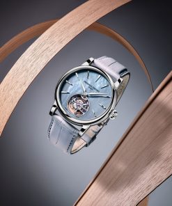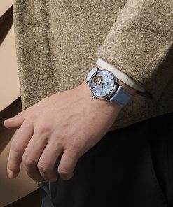 The FC-980 movement inside has been refined over more than 15 years and was updated again in 2023. It features a silicon escapement for increased durability and resistance to magnetic fields. The dial remains minimal, marked only with the Frederique Constant name, its Geneva origin, and “Swiss Made.” This simplicity allows the materials to speak for themselves, highlighted by a pale blue alligator strap and the mirror-finished white gold case.