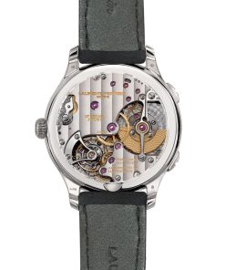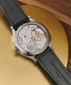 The outer ring, finished in satin-brushed slate grey, enhances the floating effect of the globe, complemented by drop-shaped indices that extend beyond the dial’s edge. Designed for globetrotters, this timepiece features a dual time zone function. Two perfectly symmetrical pushers on the left side of the case allow for effortless hour adjustments without affecting the minute hand. The date display at 3 o’clock updates automatically at midnight when crossing time zones, while the 24-hour reference time at 9 o’clock ensures an intuitive day-night distinction.