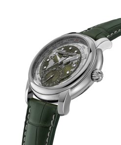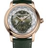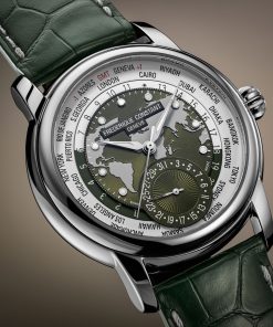 The hallmark of the Classic Worldtimer Manufacture lies in its dial’s portrayal of a world map, with a sunburst finish radiating a serene green hue. Depending on the angle of light, this green dial reveals the continents in higher relief, offering both clarity and elegance. The continents are distinct from the oceans with a polished finish. Frederique Constant’s masterful guilloché work and a matte date ring ensure perfect readability in all lighting conditions, while the Super-LumiNova-coated hour markers and luminous hands maintain legibility in the dark.
