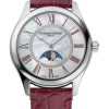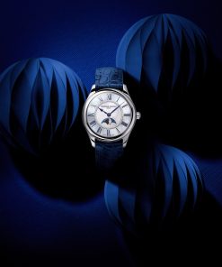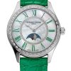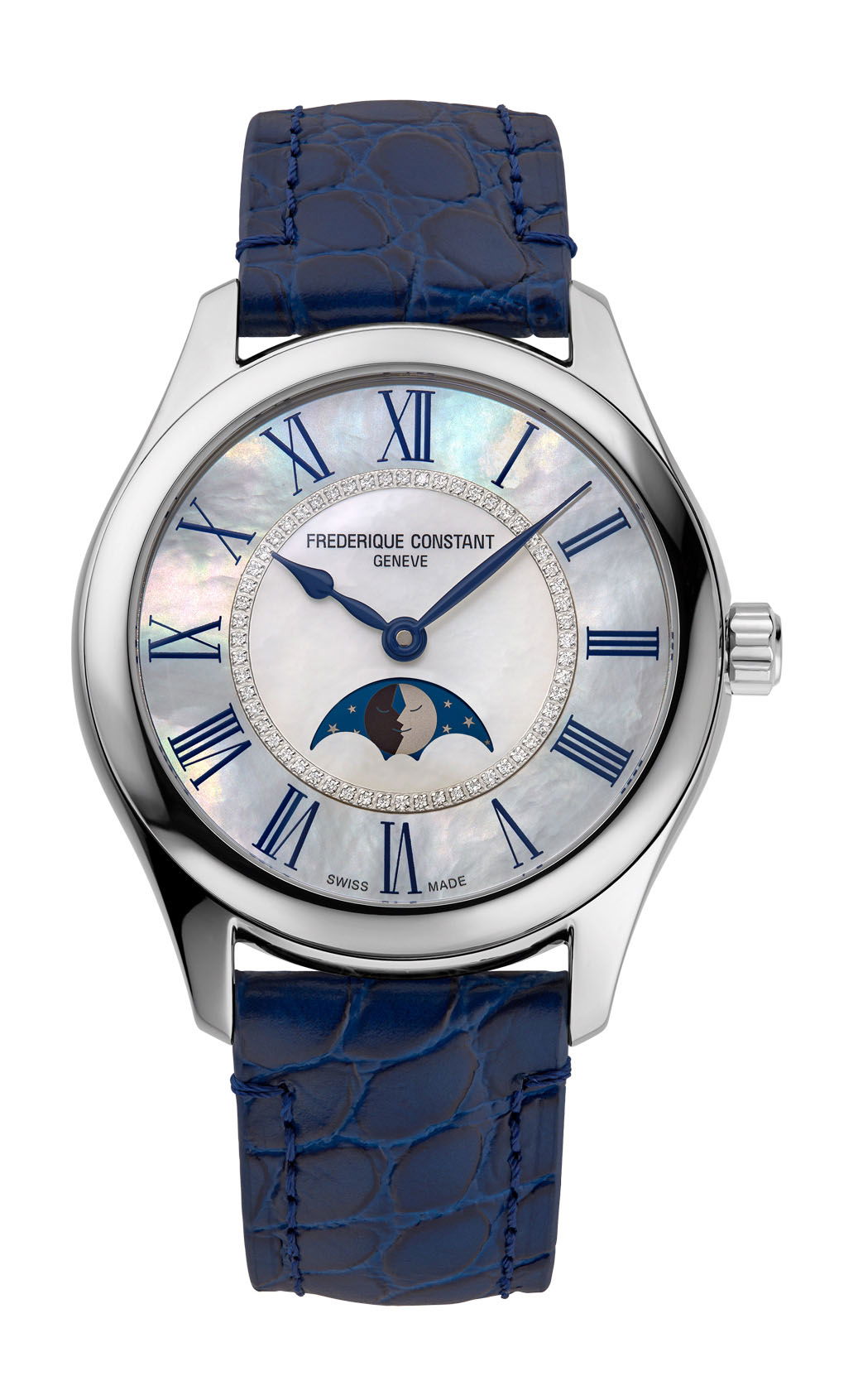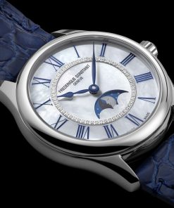 This lunar display, situated at 6 o’clock, features a unique lunar disc in shades of gray exclusively made for Frederique Constant. The steel case, highlighted with silver accents, matches the mother-of-pearl dial, reflecting pink, light green, blue, or grey hues, casting a mesmerizing play of light. The Classics Elegance Luna features a novel hour ring, replacing traditional Arabic numerals with slender Roman counterparts, matching the color of the leather strap. The watches in this collection are 36 millimeters in diameter and self-winding. They are powered by the FC-331 caliber and have a 38-hour power reserve.