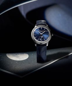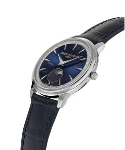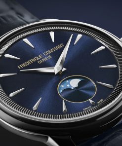 The Frederique Constant Classics Moneta Moonphase combines beauty, simplicity, and functionality, all with a guaranteed battery life of 60 months. Available in three styles: a black dial with a black leather strap, a navy blue dial with a blue leather strap, and a silver dial paired with a brown leather strap.