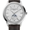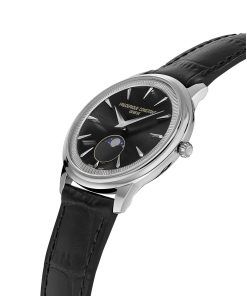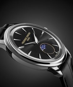 The Frederique Constant Classics Moneta Moonphase combines beauty, simplicity, and functionality, all with a guaranteed battery life of 60 months. Available in three styles: a black dial with a black leather strap, a navy blue dial with a blue leather strap, and a silver dial paired with a brown leather strap.