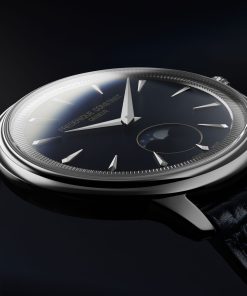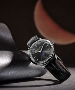 Featuring two hands for hours and minutes, along with a moon phase complication at 6 o’clock, this timepiece elegantly bridges the gap between mechanical and quartz watches. The sunburst dial, Dauphine hands, and appliqué hour markers are stylistic elements drawn from traditional fine watchmaking. The anti-reflective sapphire crystal, hand-polished hands, and genuine leather strap with matching topstitching also meet the demanding standards of a mechanical watch.