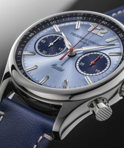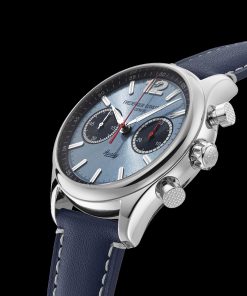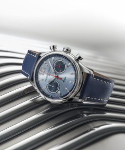 The chronograph model in this year’s Healey lineup brings more presence and function to the table. At 42 mm, it’s the largest of the three and the most openly sporty. The Healey blue dial is paired with a navy flange, giving the watch depth without overloading it. The chronograph layout features two subdials: a 30-minute counter and a running seconds. Each is easy to read, well-positioned, and fits the clean symmetry of the watch.