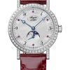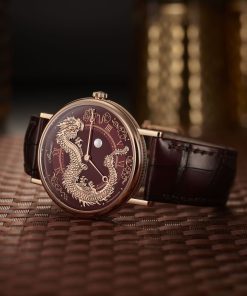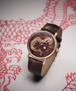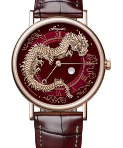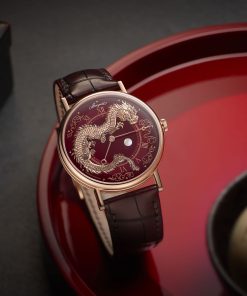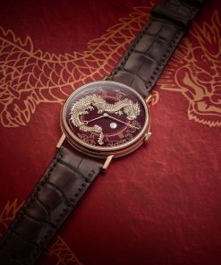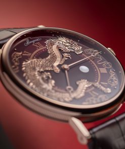 The Classique Dragon 7145 watch by Breguet showcases the expertise of its craftspeople. It features a crimson red dial in Grand Feu enamel, a complex technique that involves applying a silica and oxide mixture to the dial, followed by multiple firings at high temperatures. This process creates a unique texture and color palette. The watch’s dial is adorned with a hand-engraved rose gold dragon, guarding a pearl made from natural white mother-of-pearl. It also has Roman numerals, a minutes track, and clouds in a golden powder-pink hue, with 12 gold hour markers and Breguet’s signature open-tipped hands.