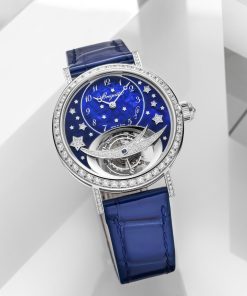 This white gold model features a mother-of-pearl dial with a shower of diamonds, gold stars, and a tourbillon displayed in a distinct area at 6 o’clock, accented with a diamond-studded shooting star and a central blue spinel. The design includes an off-centred chapter ring with Arabic numerals and rhodium-plated gold Breguet hands, and a visible serial number. The watch’s sapphire case back offers a view of the engraved baseplate with Breguet’s signature and movement reference number. Additionally, the watch is enhanced with diamonds on the bezel and lugs and a rose-cut diamond on the crown.