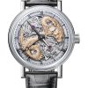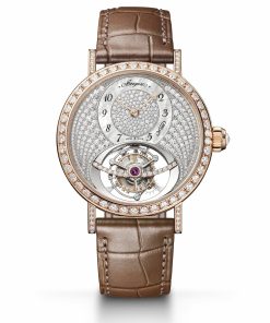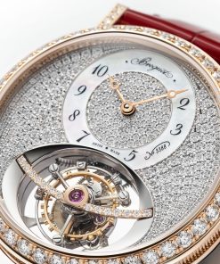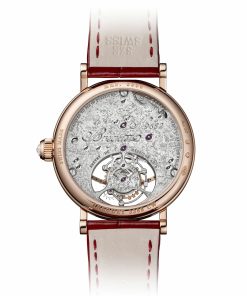 At the 12 o’clock position, the chapter ring is made of natural white mother-of-pearl. The design aligns the Arabic numerals and hands with the unique stylistic principles established by Breguet’s founder. The tourbillon, prominently situated at the lower part of the dial, sits within an elegantly curved and polished oval aperture, and is accented with a curved gold bar that is set with 14 diamonds. The sapphire case-back provides a view for the owner to appreciate the hand-engraved, hammered detailing.